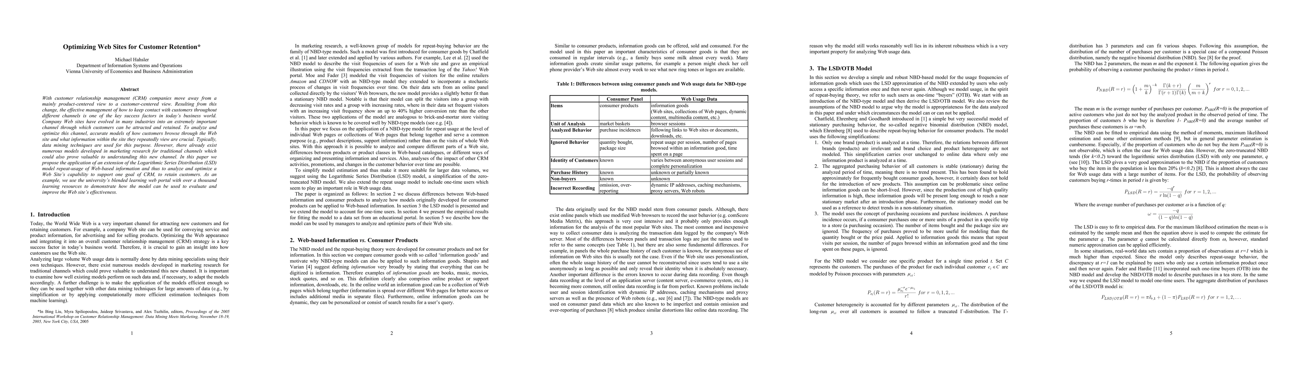 With customer relationship management (CRM) companies move away from a mainly product-centered view to a customer-centered view. Resulting from this change, the effective management of how to keep contact with customers throughout different channels is one of the key success factors in today's business world. Company Web sites have evolved in many industries into an extremely important channel through which customers can be attracted and retained. To analyze and optimize this channel, accurate models of how customers browse through the Web site and what information within the site they repeatedly view are crucial. Typically, data mining techniques are used for this purpose. However, there already exist numerous models developed in marketing research for traditional channels which could also prove valuable to understanding this new channel. In this paper we propose the application of an extension of the Logarithmic Series Distribution (LSD) model repeat-usage of Web-based information and thus to analyze and optimize a Web Site's capability to support one goal of CRM, to retain customers. As an example, we use the university's blended learning web portal with over a thousand learning resources to demonstrate how the model can be used to evaluate and improve the Web site's effectiveness.