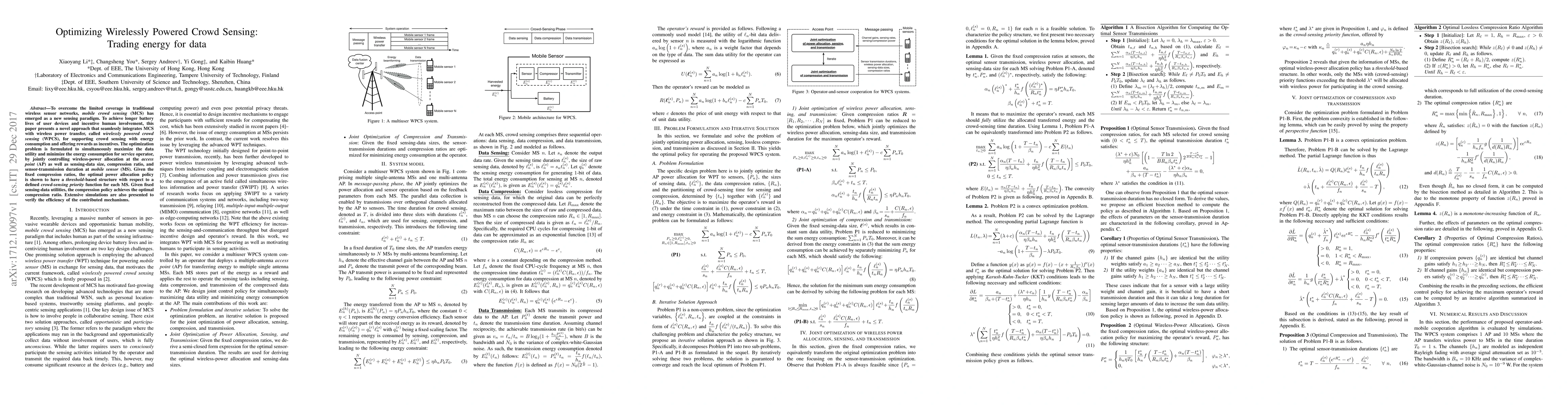 To overcome the limited coverage in traditional wireless sensor networks, \emph{mobile crowd sensing} (MCS) has emerged as a new sensing paradigm. To achieve longer battery lives of user devices and incentive human involvement, this paper presents a novel approach that seamlessly integrates MCS with wireless power transfer, called \emph{wirelessly powered crowd sensing} (WPCS), for supporting crowd sensing with energy consumption and offering rewards as incentives. The optimization problem is formulated to simultaneously maximize the data utility and minimize the energy consumption for service operator, by jointly controlling wireless-power allocation at the \emph{access point} (AP) as well as sensing-data size, compression ratio, and sensor-transmission duration at \emph{mobile sensor} (MS). Given the fixed compression ratios, the optimal power allocation policy is shown to have a \emph{threshold}-based structure with respect to a defined \emph{crowd-sensing priority} function for each MS. Given fixed sensing-data utilities, the compression policy achieves the optimal compression ratio. Extensive simulations are also presented to verify the efficiency of the contributed mechanisms.