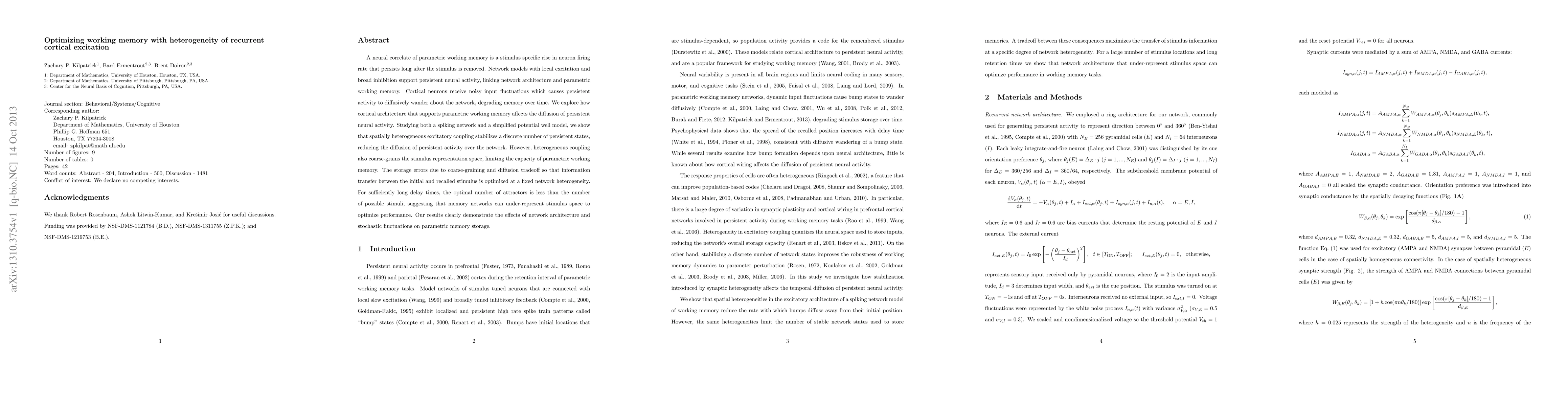 This research explores how heterogeneous excitatory coupling in cortical networks optimizes working memory by stabilizing persistent activity states while reducing diffusion, achieving a balance between memory errors and information transfer. The study reveals that under-representation of stimulus space in memory networks can enhance performance for long delays.