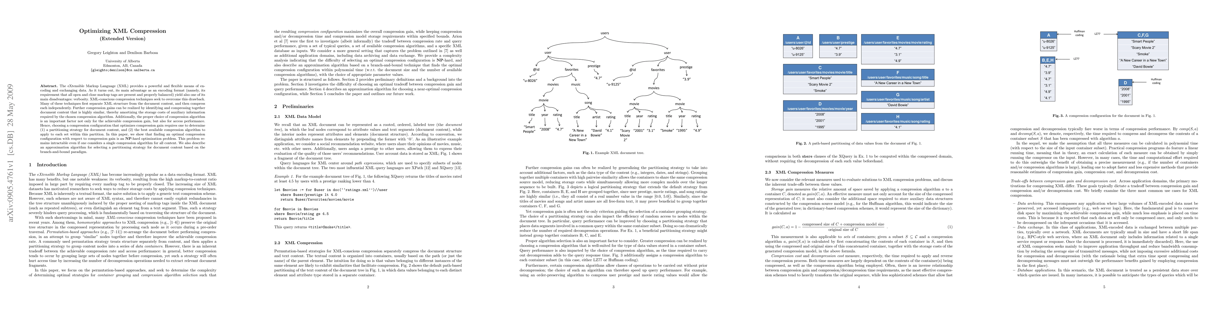 The eXtensible Markup Language (XML) provides a powerful and flexible means of encoding and exchanging data. As it turns out, its main advantage as an encoding format (namely, its requirement that all open and close markup tags are present and properly balanced) yield also one of its main disadvantages: verbosity. XML-conscious compression techniques seek to overcome this drawback. Many of these techniques first separate XML structure from the document content, and then compress each independently. Further compression gains can be realized by identifying and compressing together document content that is highly similar, thereby amortizing the storage costs of auxiliary information required by the chosen compression algorithm. Additionally, the proper choice of compression algorithm is an important factor not only for the achievable compression gain, but also for access performance. Hence, choosing a compression configuration that optimizes compression gain requires one to determine (1) a partitioning strategy for document content, and (2) the best available compression algorithm to apply to each set within this partition. In this paper, we show that finding an optimal compression configuration with respect to compression gain is an NP-hard optimization problem. This problem remains intractable even if one considers a single compression algorithm for all content. We also describe an approximation algorithm for selecting a partitioning strategy for document content based on the branch-and-bound paradigm.