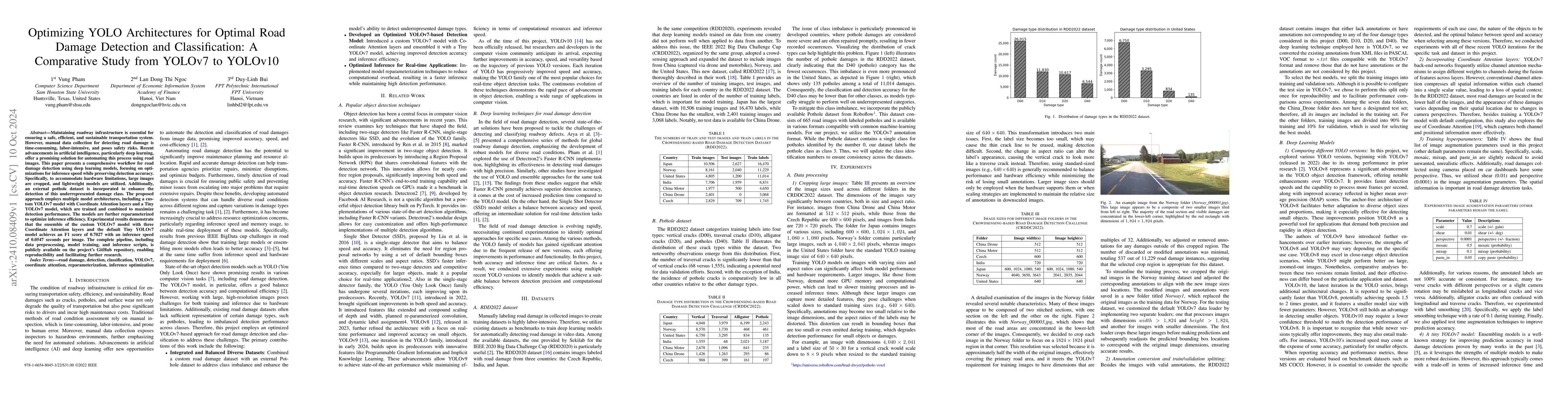 Maintaining roadway infrastructure is essential for ensuring a safe, efficient, and sustainable transportation system. However, manual data collection for detecting road damage is time-consuming, labor-intensive, and poses safety risks. Recent advancements in artificial intelligence, particularly deep learning, offer a promising solution for automating this process using road images. This paper presents a comprehensive workflow for road damage detection using deep learning models, focusing on optimizations for inference speed while preserving detection accuracy. Specifically, to accommodate hardware limitations, large images are cropped, and lightweight models are utilized. Additionally, an external pothole dataset is incorporated to enhance the detection of this underrepresented damage class. The proposed approach employs multiple model architectures, including a custom YOLOv7 model with Coordinate Attention layers and a Tiny YOLOv7 model, which are trained and combined to maximize detection performance. The models are further reparameterized to optimize inference efficiency. Experimental results demonstrate that the ensemble of the custom YOLOv7 model with three Coordinate Attention layers and the default Tiny YOLOv7 model achieves an F1 score of 0.7027 with an inference speed of 0.0547 seconds per image. The complete pipeline, including data preprocessing, model training, and inference scripts, is publicly available on the project's GitHub repository, enabling reproducibility and facilitating further research.