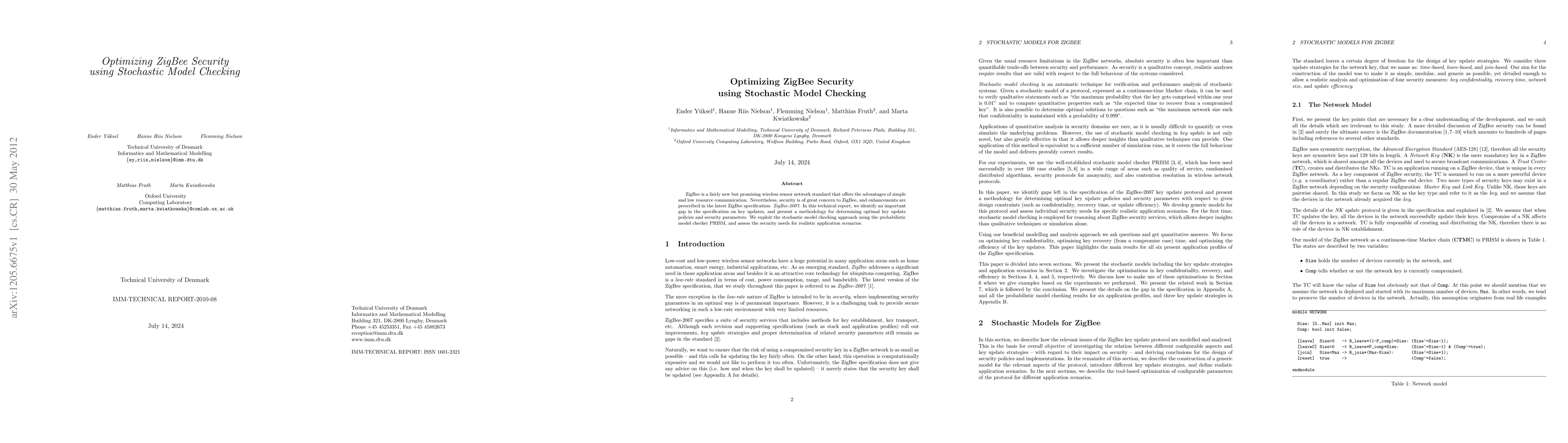 This paper identifies a key update specification gap in ZigBee-2007 and proposes a stochastic model checking methodology using PRISM to determine optimal key update policies and security parameters for realistic application scenarios.