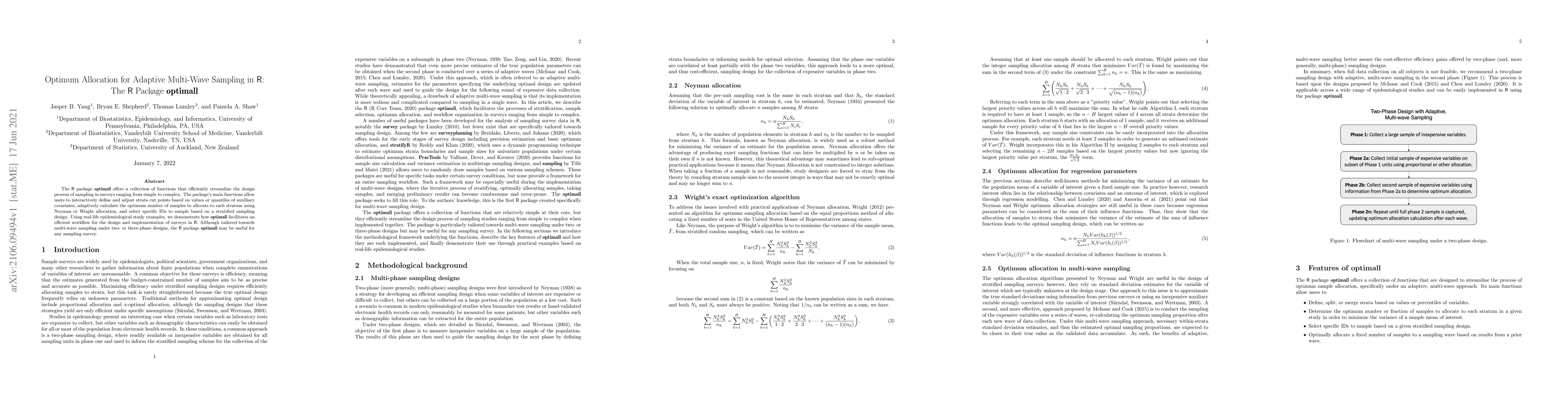 The R package optimall streamlines survey design with interactive strata cut point adjustments and adaptive sample allocation for efficient multi-wave sampling. It facilitates an efficient workflow for epidemiological studies and may be useful for any sampling survey.