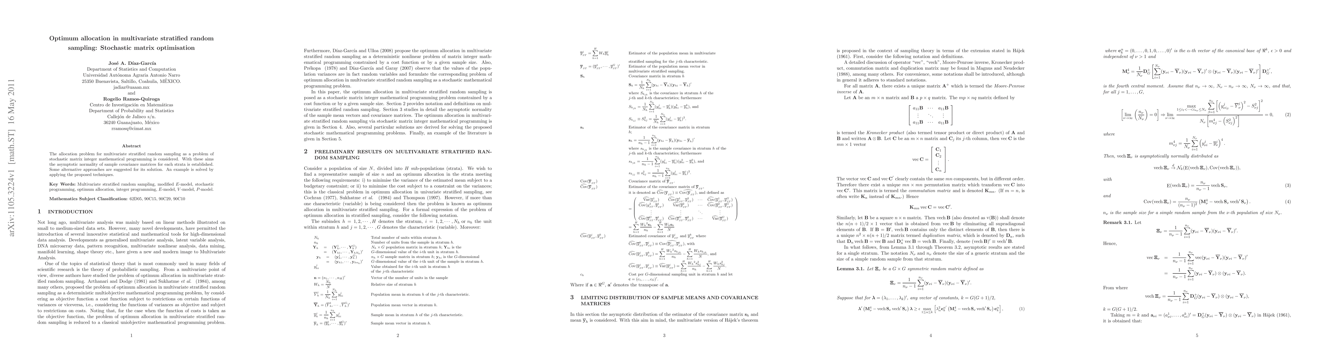 This paper addresses the allocation problem in multivariate stratified random sampling through stochastic matrix optimization. It establishes the asymptotic normality of sample covariance matrices for each stratum and proposes alternative solution methods, illustrated with an example.