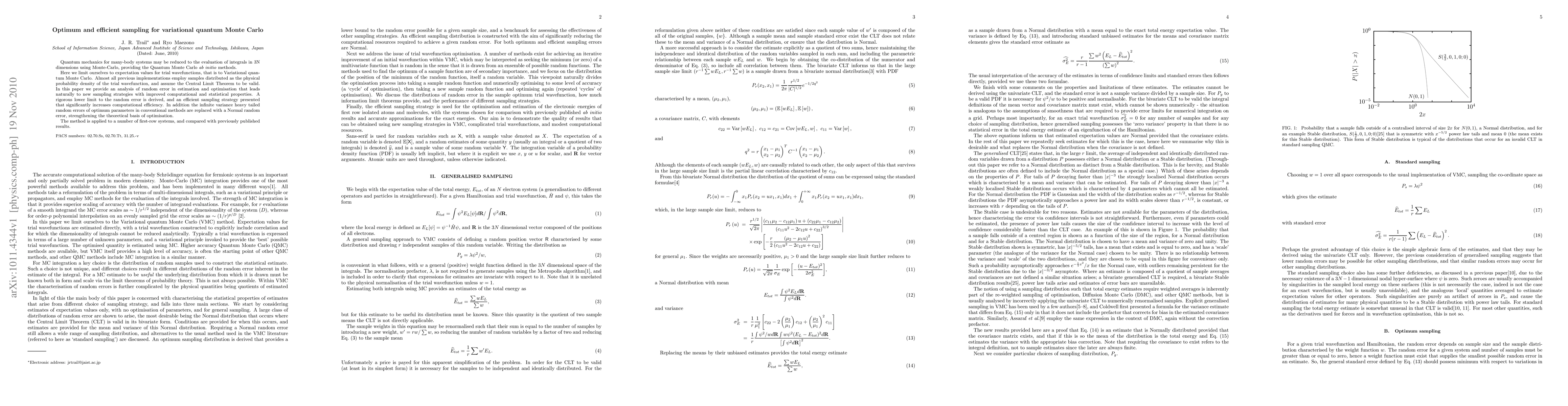 Quantum mechanics for many-body systems may be reduced to the evaluation of integrals in 3N dimensions using Monte-Carlo, providing the Quantum Monte Carlo ab initio methods. Here we limit ourselves to expectation values for trial wavefunctions, that is to Variational quantum Monte Carlo. Almost all previous implementations employ samples distributed as the physical probability density of the trial wavefunction, and assume the Central Limit Theorem to be valid. In this paper we provide an analysis of random error in estimation and optimisation that leads naturally to new sampling strategies with improved computational and statistical properties. A rigorous lower limit to the random error is derived, and an efficient sampling strategy presented that significantly increases computational efficiency. In addition the infinite variance heavy tailed random errors of optimum parameters in conventional methods are replaced with a Normal random error, strengthening the theoretical basis of optimisation. The method is applied to a number of first-row systems, and compared with previously published results.