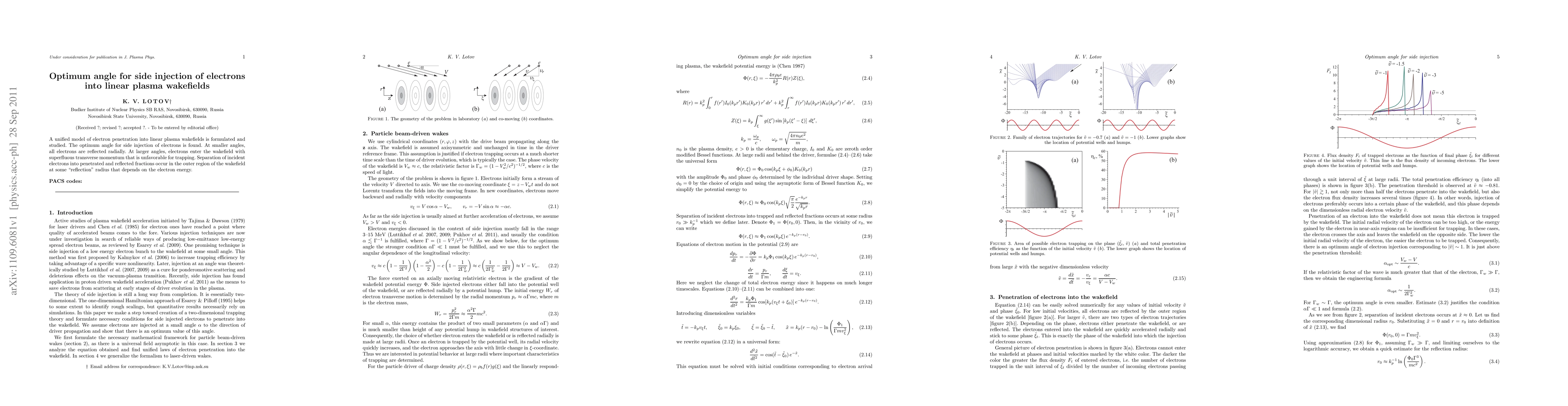 A unified model of electron penetration into linear plasma wakefields is formulated and studied. The optimum angle for side injection of electrons is found. At smaller angles, all electrons are reflected radially. At larger angles, electrons enter the wakefield with superfluous transverse momentum that is unfavorable for trapping. Separation of incident electrons into penetrated and reflected fractions occur in the outer region of the wakefield at some "reflection" radius that depends on the electron energy.