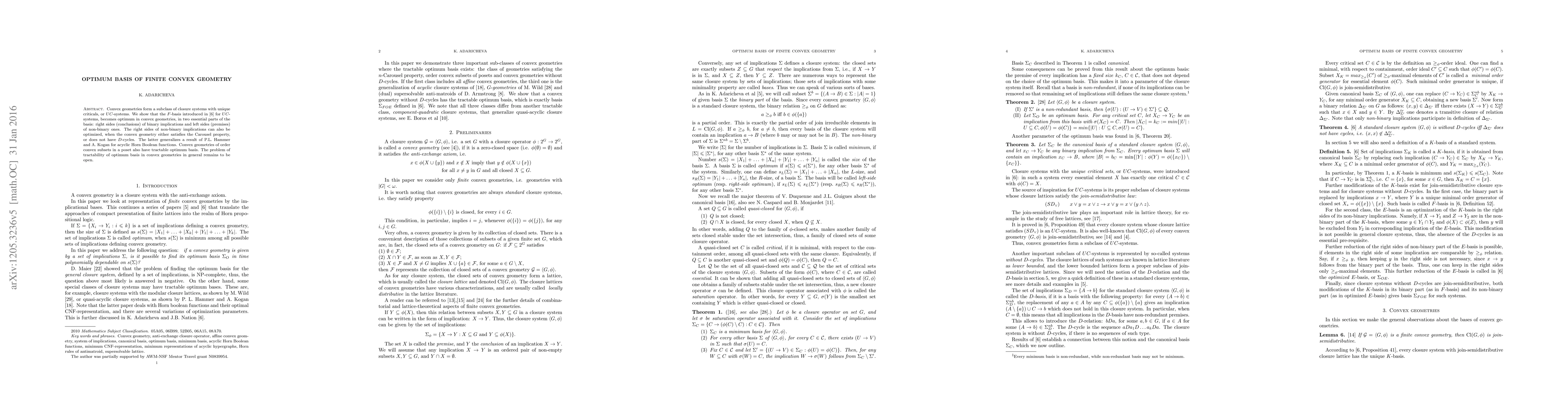 Convex geometries form a subclass of closure systems with unique criticals, or $UC$-systems. We show that the $F$-basis introduced in [1] for $UC$-systems, becomes optimum in convex geometries, in two essential parts of the basis: right sides (conclusions) of binary implications and left sides (premises) of non-binary ones. The right sides of non-binary implications can also be optimized, when the convex geometry either satisfies the Carousel property, or does not have $D$-cycles. The latter generalizes a result of P.L.~Hammer and A.~Kogan for acyclic Horn Boolean functions. Convex geometries of order convex subsets in a poset also have tractable optimum basis. The problem of tractability of optimum basis in convex geometries in general remains to be open. [1] K. Adaricheva and J.B.Nation, On implicational bases of closure systems with unique critical sets, arxiv:1205.2881