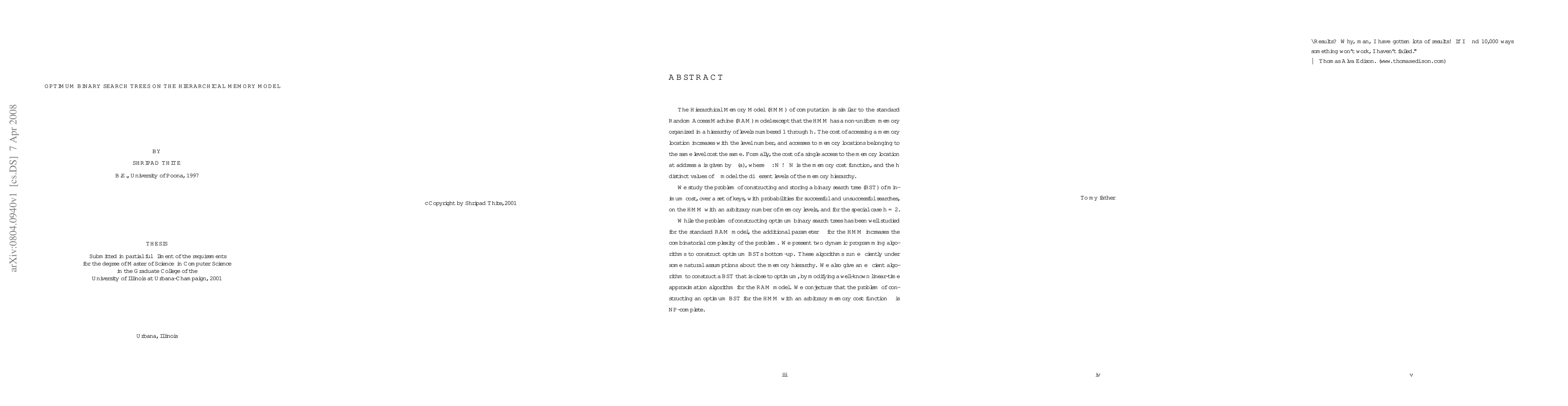 The Hierarchical Memory Model (HMM) of computation is similar to the standard Random Access Machine (RAM) model except that the HMM has a non-uniform memory organized in a hierarchy of levels numbered 1 through h. The cost of accessing a memory location increases with the level number, and accesses to memory locations belonging to the same level cost the same. Formally, the cost of a single access to the memory location at address a is given by m(a), where m: N -> N is the memory cost function, and the h distinct values of m model the different levels of the memory hierarchy. We study the problem of constructing and storing a binary search tree (BST) of minimum cost, over a set of keys, with probabilities for successful and unsuccessful searches, on the HMM with an arbitrary number of memory levels, and for the special case h=2. While the problem of constructing optimum binary search trees has been well studied for the standard RAM model, the additional parameter m for the HMM increases the combinatorial complexity of the problem. We present two dynamic programming algorithms to construct optimum BSTs bottom-up. These algorithms run efficiently under some natural assumptions about the memory hierarchy. We also give an efficient algorithm to construct a BST that is close to optimum, by modifying a well-known linear-time approximation algorithm for the RAM model. We conjecture that the problem of constructing an optimum BST for the HMM with an arbitrary memory cost function m is NP-complete.