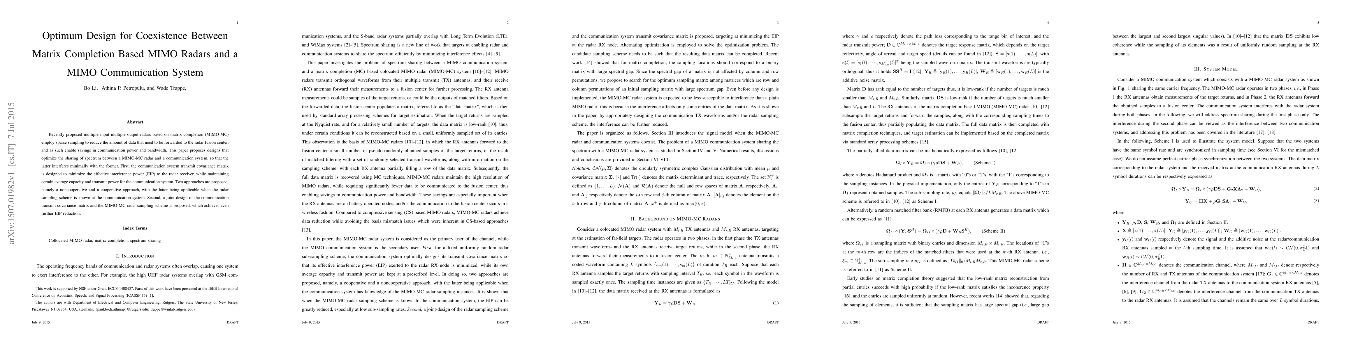 This paper proposes optimal designs for spectrum sharing between matrix completion-based MIMO radars and MIMO communication systems to minimize interference. It introduces both noncooperative and cooperative approaches to design the communication system's transmit covariance matrix, with the cooperative approach leveraging known radar sampling schemes.