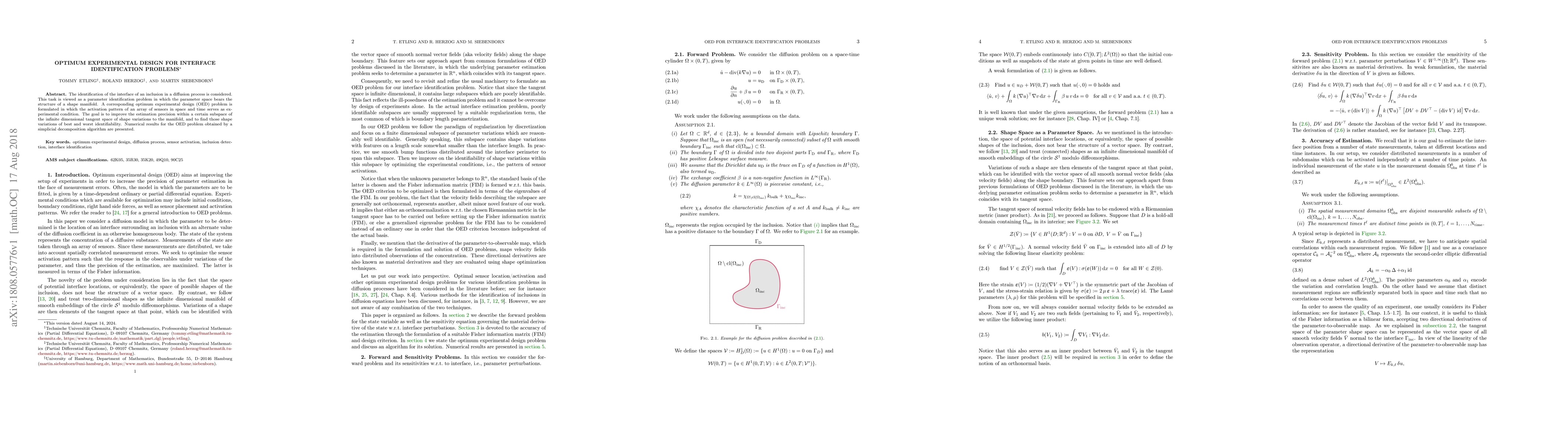 The identification of the interface of an inclusion in a diffusion process is considered. This task is viewed as a parameter identification problem in which the parameter space bears the structure of a shape manifold. A corresponding optimum experimental design (OED) problem is formulated in which the activation pattern of an array of sensors in space and time serves as experimental condition. The goal is to improve the estimation precision within a certain subspace of the infinite dimensional tangent space of shape variations to the manifold, and to find those shape variations of best and worst identifiability. Numerical results for the OED problem obtained by a simplicial decomposition algorithm are presented.