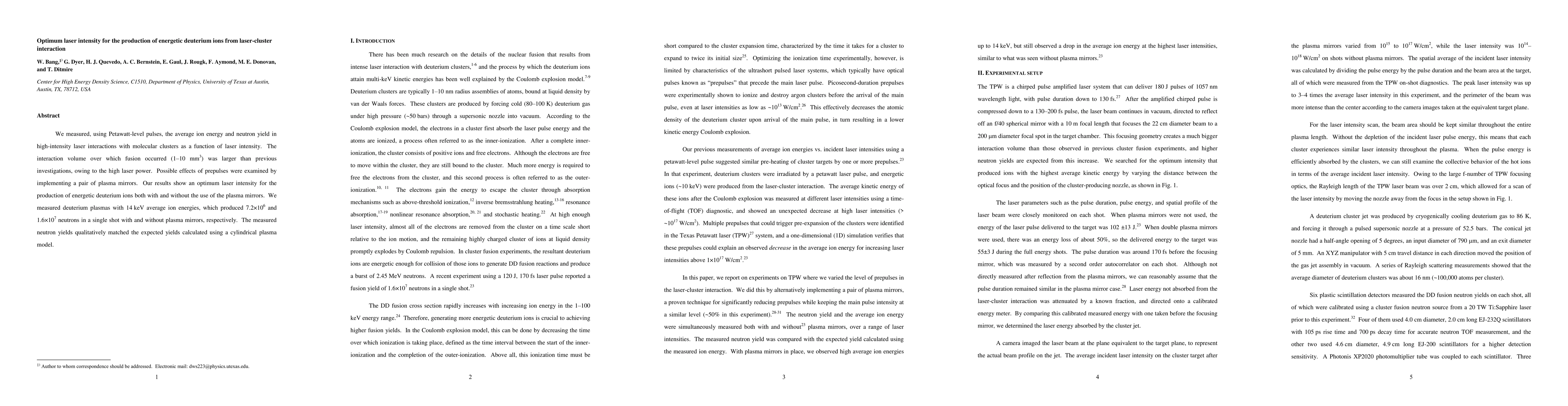 This study investigates the optimum laser intensity for producing energetic deuterium ions via laser-cluster interactions, achieving 14 keV average ion energies and neutron yields of 7.2x10^6 and 1.6x10^7 neutrons with and without plasma mirrors, respectively. The results indicate an optimal laser intensity for maximum ion energy and neutron production.