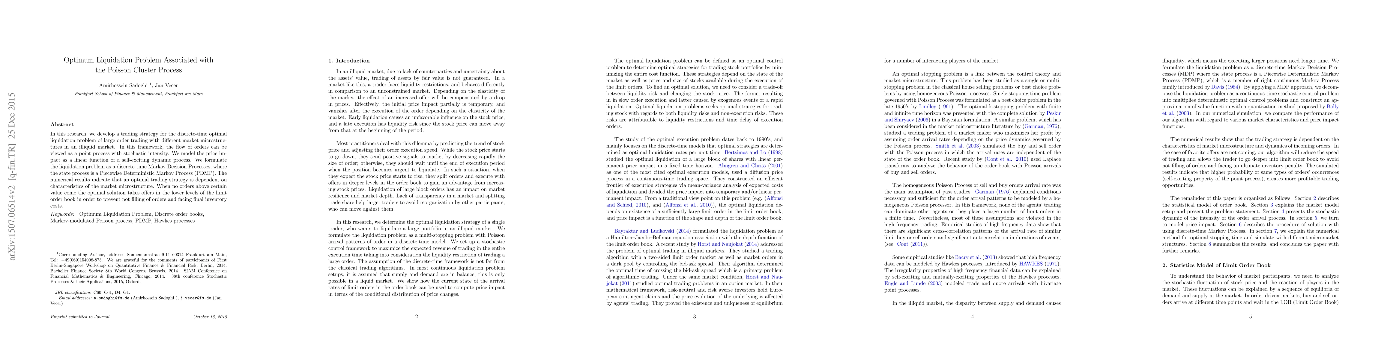 In this research, we develop a trading strategy for the discrete-time optimal liquidation problem of large order trading with different market microstructures in an illiquid market. In this framework, the flow of orders can be viewed as a point process with stochastic intensity. We model the price impact as a linear function of a self-exciting dynamic process. We formulate the liquidation problem as a discrete-time Markov Decision Processes, where the state process is a Piecewise Deterministic Markov Process (PDMP). The numerical results indicate that an optimal trading strategy is dependent on characteristics of the market microstructure. When no orders above certain value come the optimal solution takes offers in the lower levels of the limit order book in order to prevent not filling of orders and facing final inventory costs.