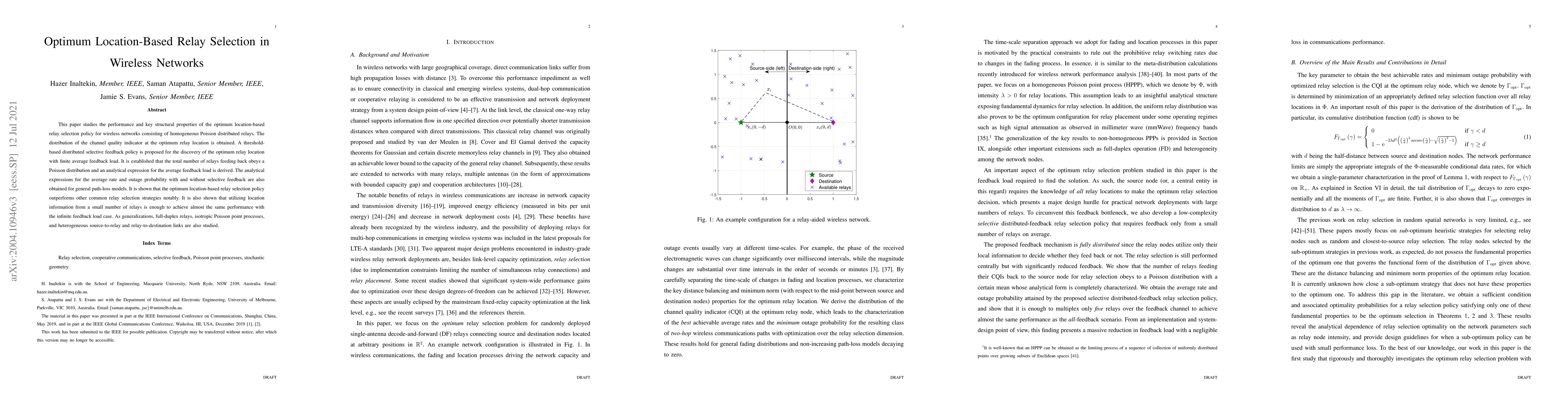 This paper investigates the optimum location-based relay selection in wireless networks, proposing a threshold-based feedback policy that minimizes average feedback load while maintaining high performance. It demonstrates that a small number of relays can achieve near-optimal results, and generalizes findings to full-duplex relays and heterogeneous networks.