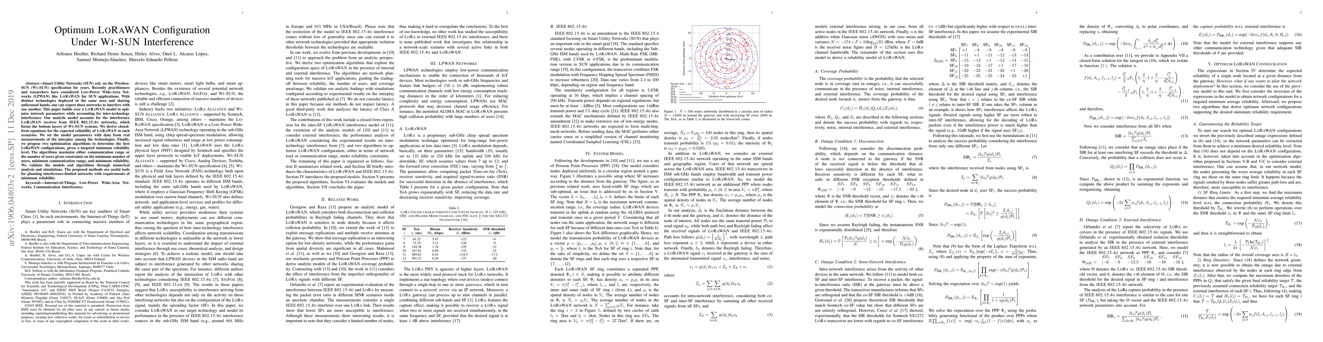 This paper optimizes LoRaWAN configurations under Wi-SUN interference by developing an analytic model that accounts for interference from IEEE 802.15.4g networks. It proposes two optimization algorithms to maximize communication range or user numbers while meeting minimum reliability constraints, validated through numerical analysis and simulations.