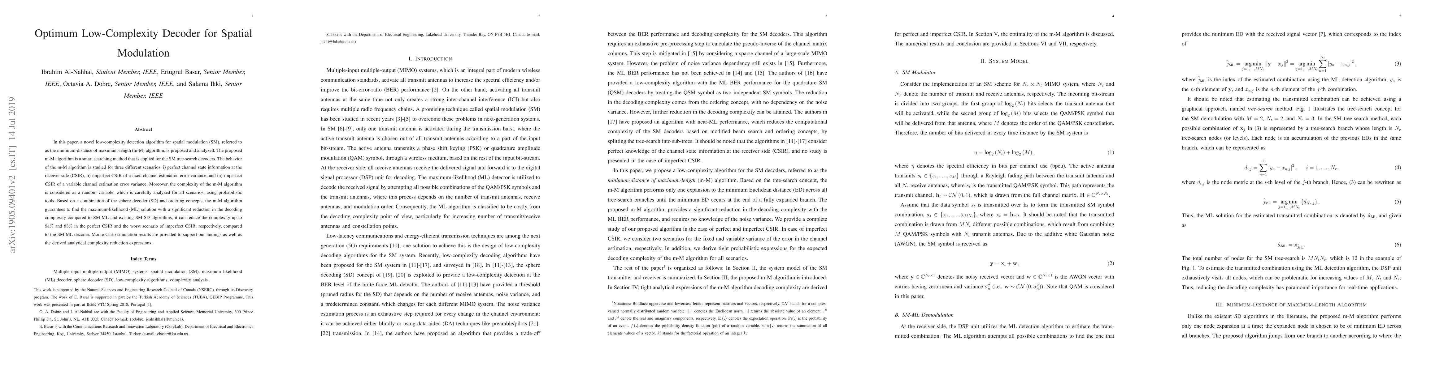This paper proposes a novel low-complexity detection algorithm, the minimum-distance of maximum-length (m-M) algorithm, for spatial modulation, achieving significant complexity reduction compared to existing methods. The algorithm's performance is analyzed under various scenarios of channel state information availability, and its complexity is shown to reduce up to 94% in perfect conditions and 85% in the worst-case imperfect scenarios, supported by Monte Carlo simulations.