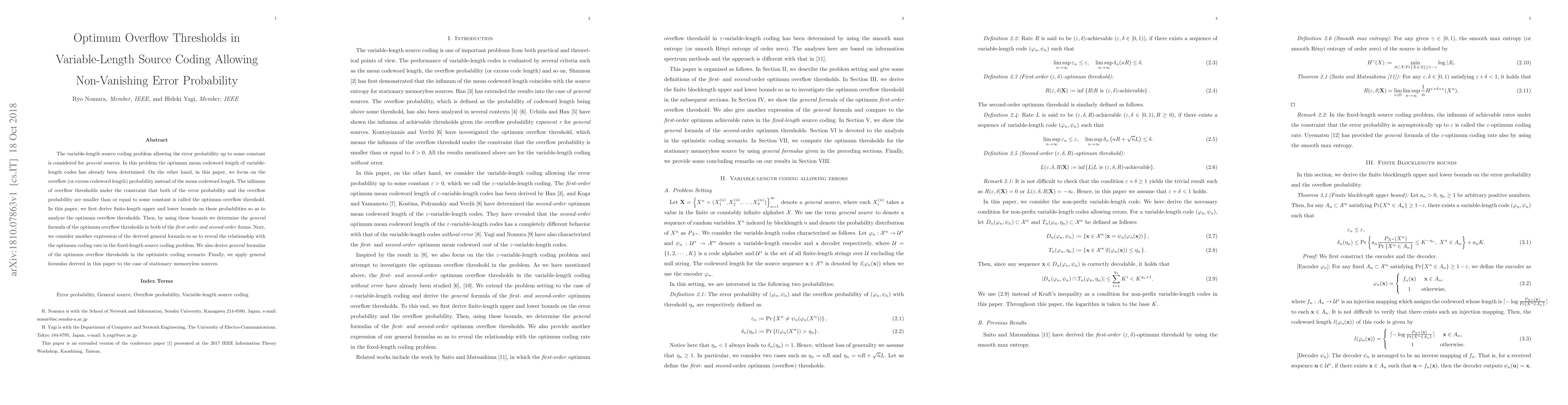 This paper studies the variable-length source coding problem with allowable error probabilities, focusing on deriving optimum overflow thresholds. It establishes upper and lower bounds for overflow and error probabilities, and presents formulas for these thresholds in both first-order and second-order forms, linking them to the optimum coding rate in fixed-length coding.