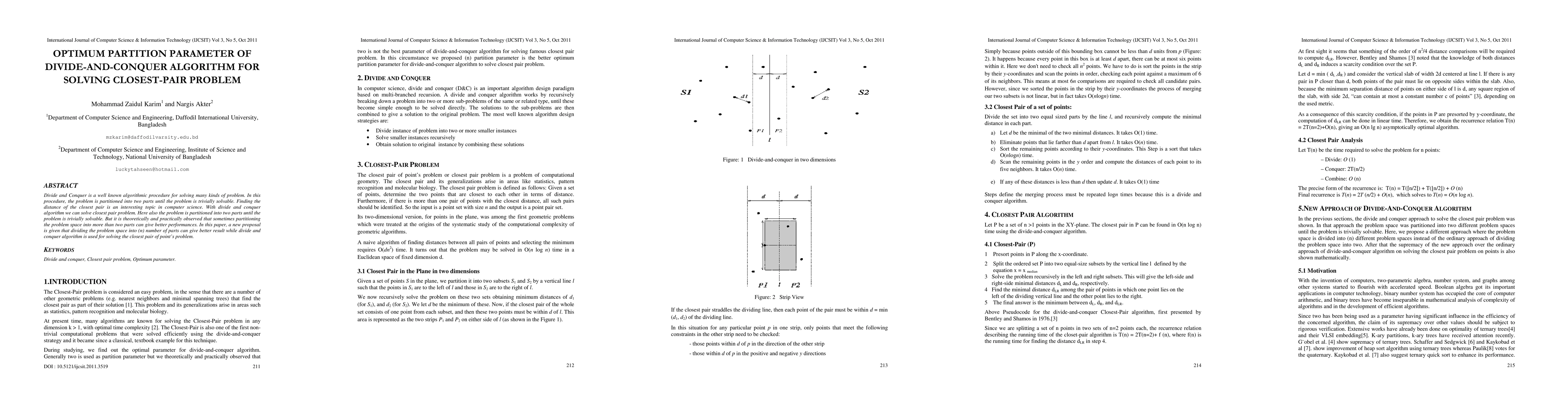 This paper proposes an optimized partition parameter for the divide-and-conquer algorithm to solve the closest-pair problem, suggesting that dividing the problem space into (n) parts may yield better performance compared to traditional two-part divisions. The study explores both theoretical and practical implications of this approach.