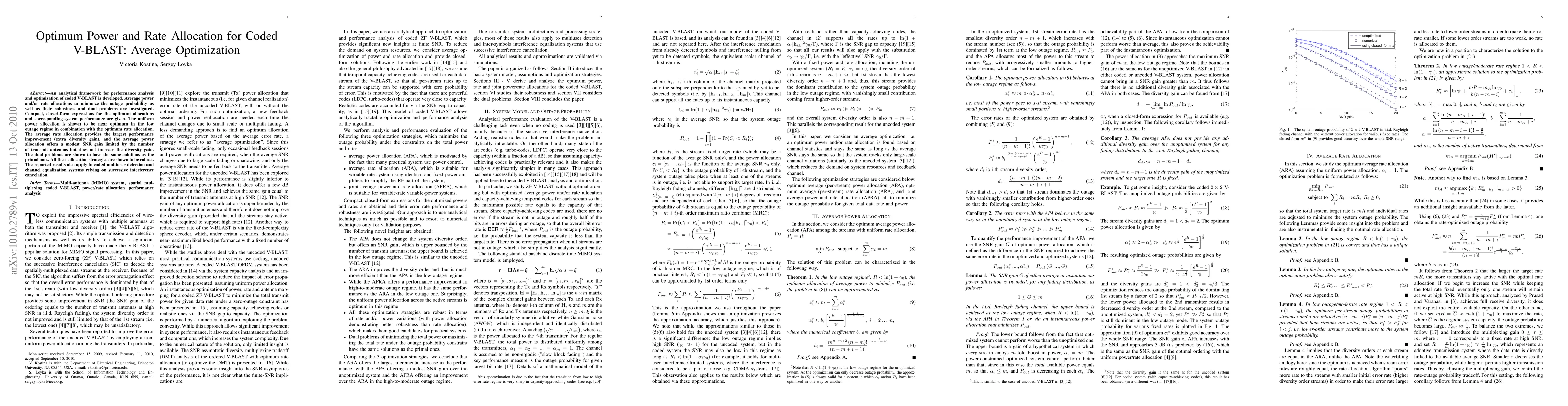An analytical framework for performance analysis and optimization of coded V-BLAST is developed. Average power and/or rate allocations to minimize the outage probability as well as their robustness and dual problems are investigated. Compact, closed-form expressions for the optimum allocations and corresponding system performance are given. The uniform power allocation is shown to be near optimum in the low outage regime in combination with the optimum rate allocation. The average rate allocation provides the largest performance improvement (extra diversity gain), and the average power allocation offers a modest SNR gain limited by the number of transmit antennas but does not increase the diversity gain. The dual problems are shown to have the same solutions as the primal ones. All these allocation strategies are shown to be robust. The reported results also apply to coded multiuser detection and channel equalization systems relying on successive interference cancelation.