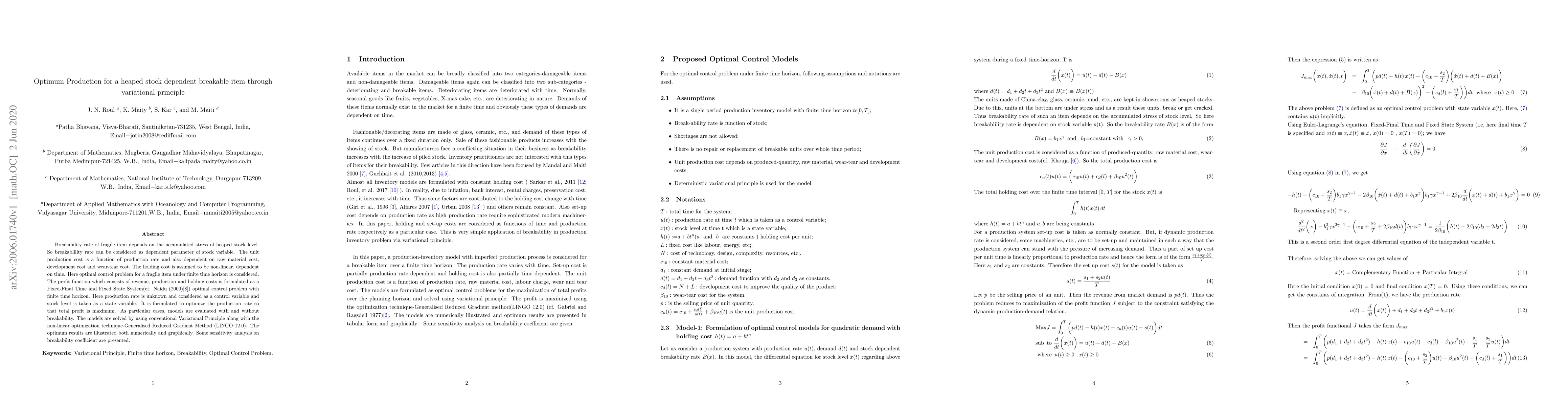 Breakability rate of fragile item depends on the accumulated stress of heaped stock level. So breakablility rate can be considered as dependent parameter of stock variable. The unit production cost is a function of production rate and also dependent on raw material cost, development cost and wear-tear cost. The holding cost is assumed to be non-linear, dependent on time. Here optimal control problem for a fragile item under finite time horizon is considered. The profit function which consists of revenue, production and holding costs is formulated as a Fixed-Final Time and Fixed State System(cf. Naidu (2000)) optimal control problem with finite time horizon. Here production rate is unknown and considered as a control variable and stock level is taken as a state variable. It is formulated to optimize the production rate so that total profit is maximum. As particular cases, models are evaluated with and without breakability. The models are solved by using conventional Variational Principle along with the non-linear optimization technique-Generalised Reduced Gradient Method (LINGO 12.0). The optimum results are illustrated both numerically and graphically. Some sensitivity analysis on breakability coefficient are presented.