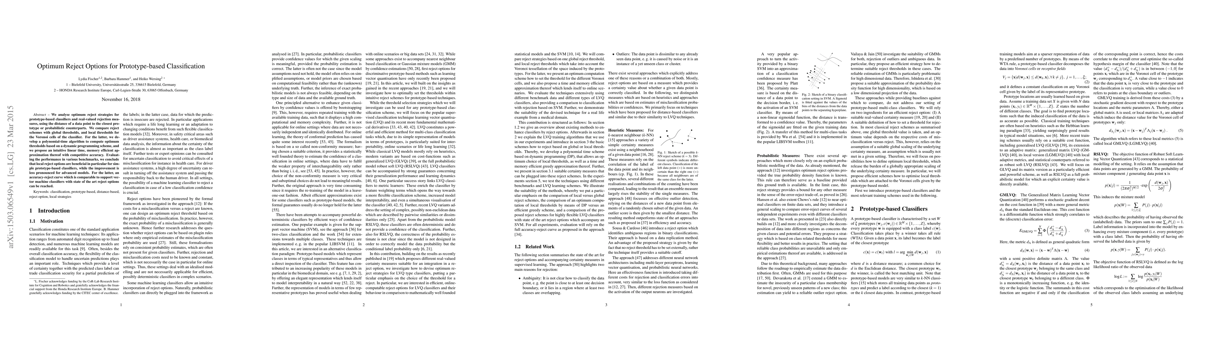 This paper evaluates optimum reject strategies for prototype-based classifiers, comparing global and local thresholds and introducing a dynamic programming algorithm for local thresholds computation. Results show that local thresholds improve performance for simple classifiers, while advanced models achieve competitive accuracy with support vector machines.