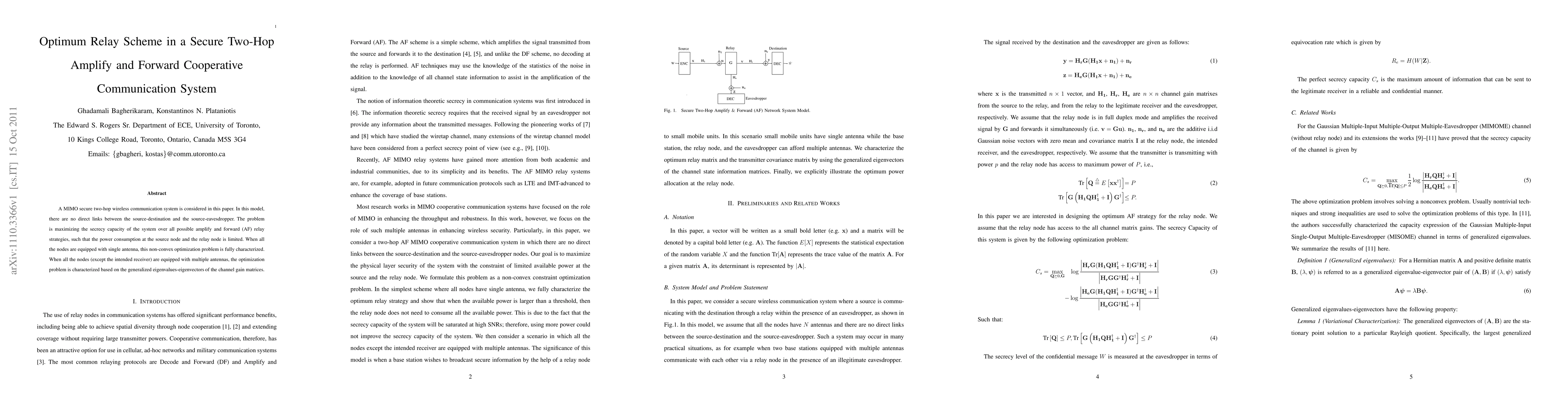 This paper investigates the optimal relay strategy in a secure two-hop MIMO wireless communication system using amplify and forward (AF) relays. The study maximizes secrecy capacity under power constraints, fully characterizing the problem when nodes have single antennas and using generalized eigenvalues for systems with multiple antennas.
