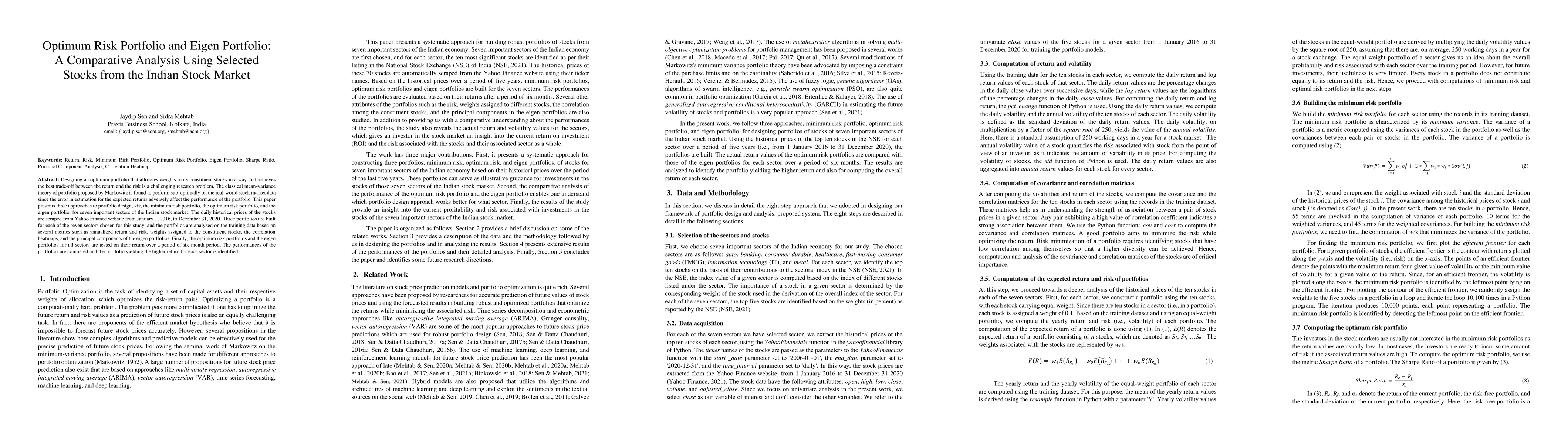 Designing an optimum portfolio that allocates weights to its constituent stocks in a way that achieves the best trade-off between the return and the risk is a challenging research problem. The classical mean-variance theory of portfolio proposed by Markowitz is found to perform sub-optimally on the real-world stock market data since the error in estimation for the expected returns adversely affects the performance of the portfolio. This paper presents three approaches to portfolio design, viz, the minimum risk portfolio, the optimum risk portfolio, and the Eigen portfolio, for seven important sectors of the Indian stock market. The daily historical prices of the stocks are scraped from Yahoo Finance website from January 1, 2016, to December 31, 2020. Three portfolios are built for each of the seven sectors chosen for this study, and the portfolios are analyzed on the training data based on several metrics such as annualized return and risk, weights assigned to the constituent stocks, the correlation heatmaps, and the principal components of the Eigen portfolios. Finally, the optimum risk portfolios and the Eigen portfolios for all sectors are tested on their return over a period of a six-month period. The performances of the portfolios are compared and the portfolio yielding the higher return for each sector is identified.