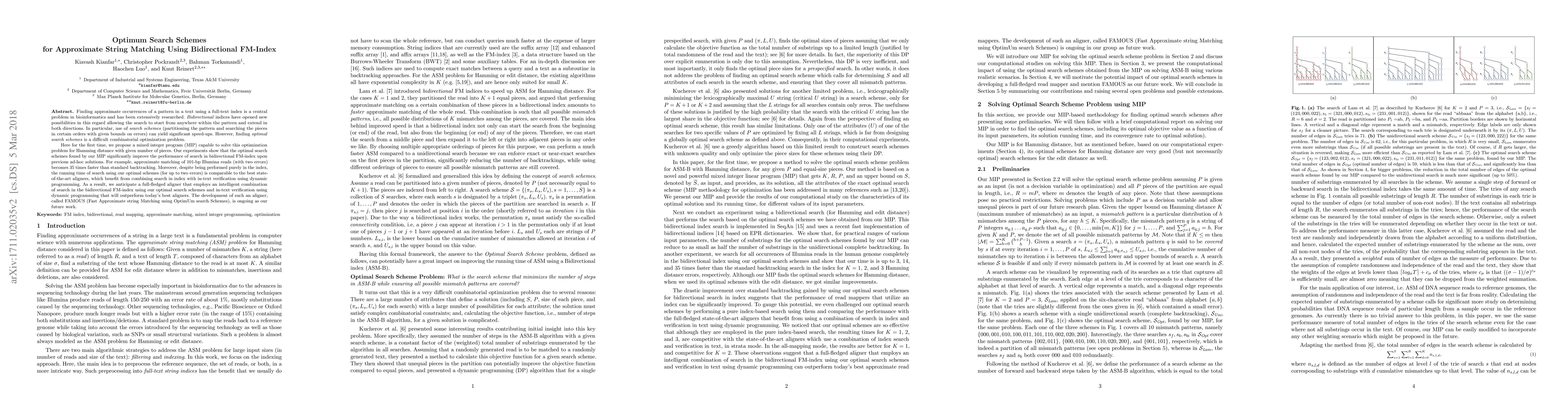 The paper introduces a novel mixed integer programming method to find optimal search schemes for approximate string matching in a bidirectional FM-index, which significantly outperforms standard backtracking methods.