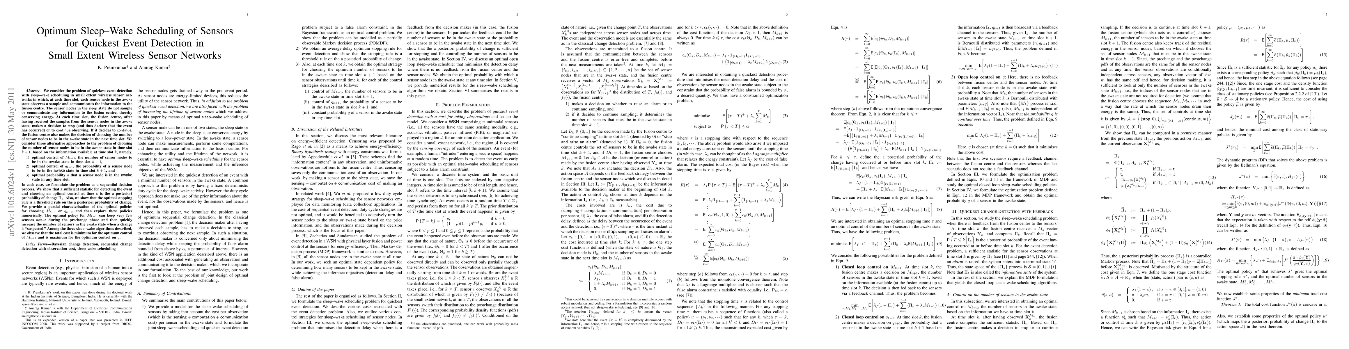 This paper investigates optimal sleep-wake scheduling strategies for quickest event detection in small wireless sensor networks. It proposes three approaches to manage sensor node wake states, showing that the optimal control of the number of awake nodes (M_{k+1}) minimizes total cost compared to controlling the probability of a node being awake (q_{k+1}) or maintaining a constant probability (q).