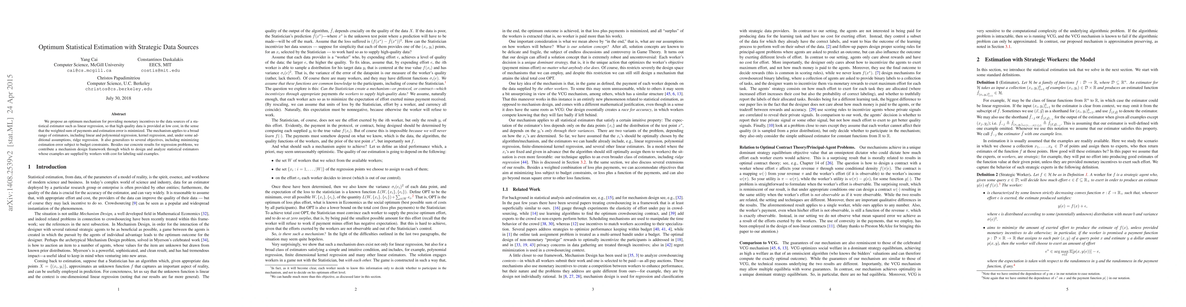 This paper proposes a mechanism for incentivizing high-quality data sources to minimize the sum of payments and estimation error in statistical estimators like linear regression. It applies broadly to various regression techniques and generalizes to multiple objectives under budget constraints.