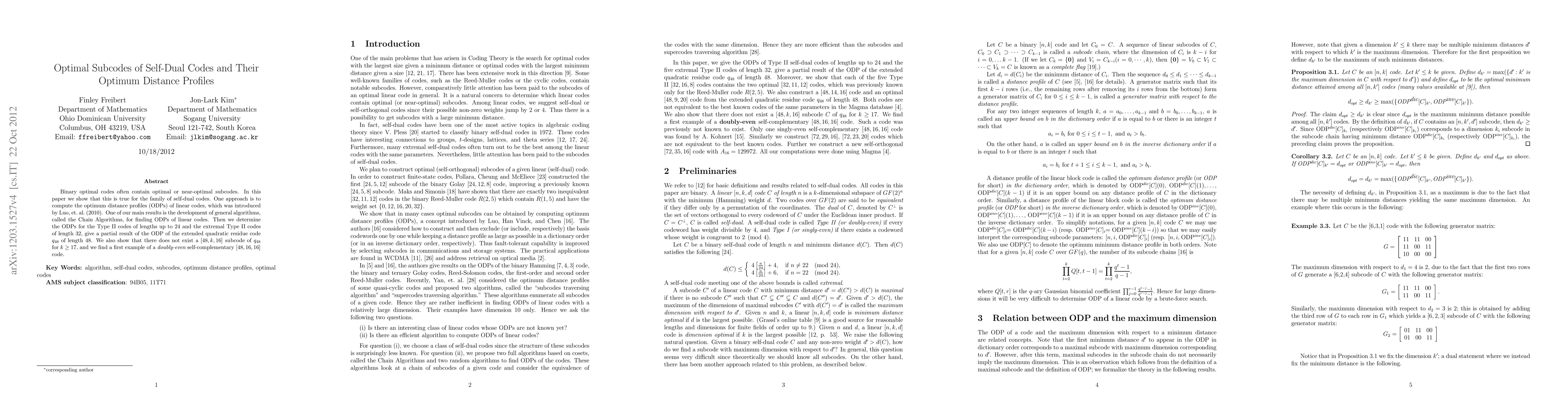 Binary optimal codes often contain optimal or near-optimal subcodes. In this paper we show that this is true for the family of self-dual codes. One approach is to compute the optimum distance profiles (ODPs) of linear codes, which was introduced by Luo, et. al. (2010). One of our main results is the development of general algorithms, called the Chain Algorithms, for finding ODPs of linear codes. Then we determine the ODPs for the Type II codes of lengths up to 24 and the extremal Type II codes of length 32, give a partial result of the ODP of the extended quadratic residue code $q_{48}$ of length 48. We also show that there does not exist a $[48,k,16]$ subcode of $q_{48}$ for $k \ge 17$, and we find a first example of a doubly-even self-complementary $[48, 16, 16]$ code.