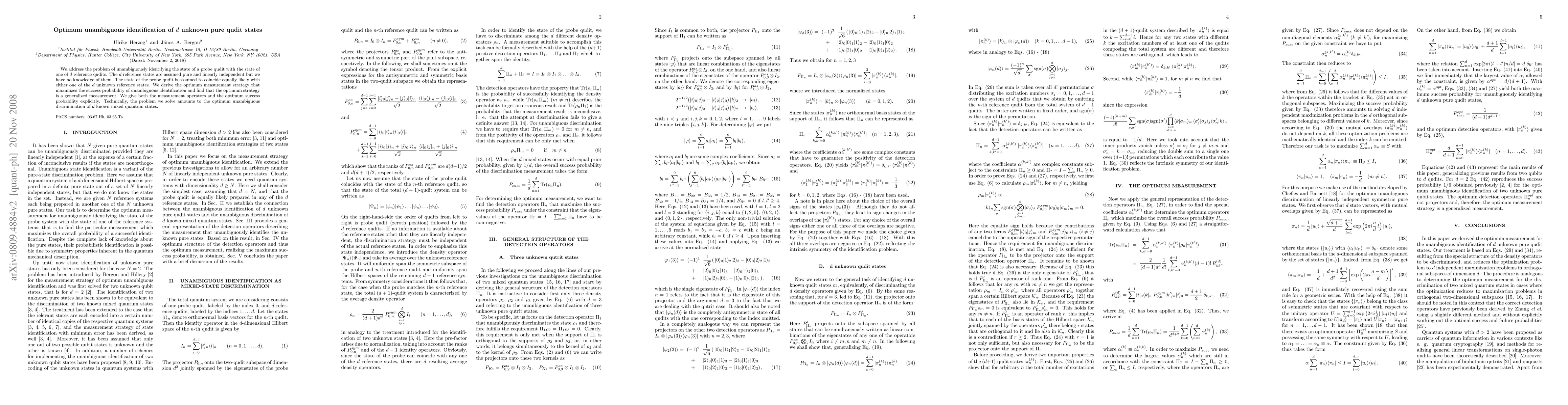 This paper develops an optimum measurement strategy for unambiguously identifying an unknown pure qudit state among d reference states, deriving generalized measurement operators that maximize the success probability of identification. The optimum success probability is explicitly provided.