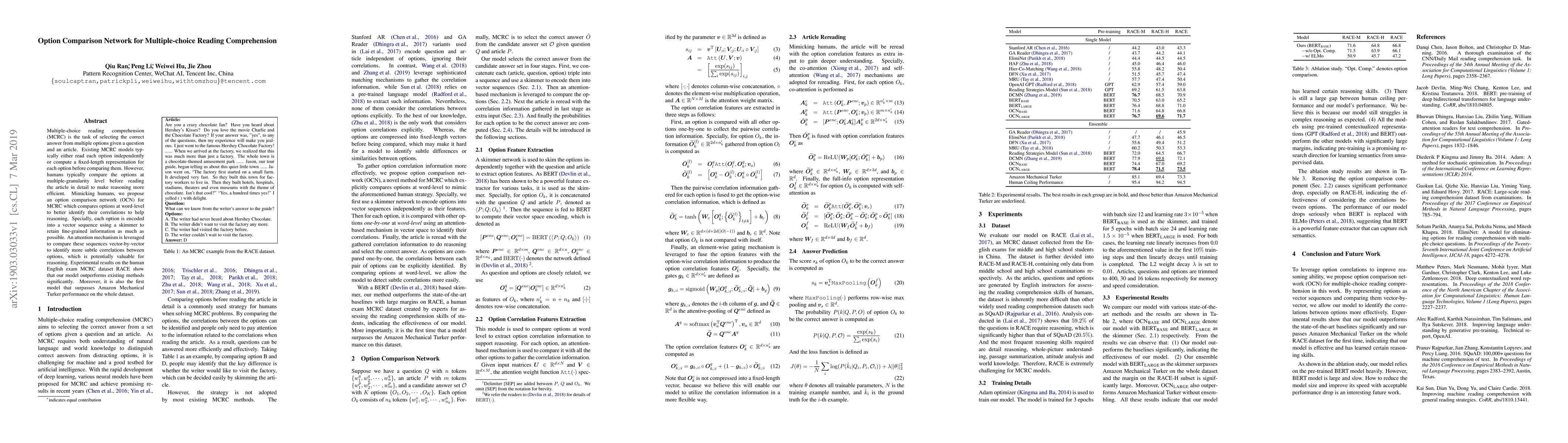The paper proposes an Option Comparison Network (OCN) for multiple-choice reading comprehension that compares options at word-level to identify correlations, outperforming existing methods and surpassing human-like performance on the RACE dataset. The OCN encodes options into vector sequences and uses an attention mechanism to detect subtle correlations.