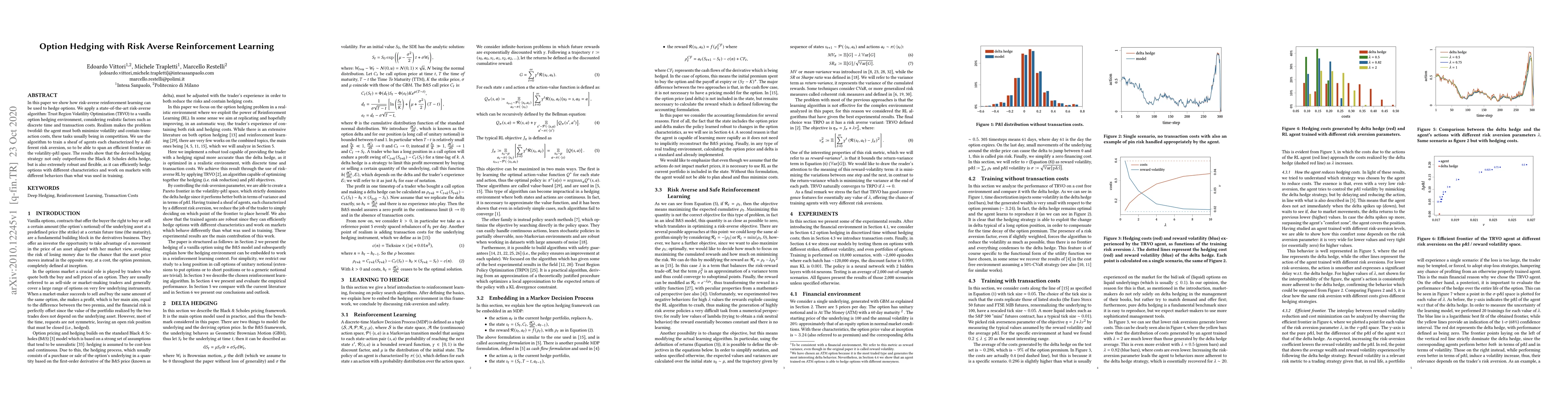 In this paper we show how risk-averse reinforcement learning can be used to hedge options. We apply a state-of-the-art risk-averse algorithm: Trust Region Volatility Optimization (TRVO) to a vanilla option hedging environment, considering realistic factors such as discrete time and transaction costs. Realism makes the problem twofold: the agent must both minimize volatility and contain transaction costs, these tasks usually being in competition. We use the algorithm to train a sheaf of agents each characterized by a different risk aversion, so to be able to span an efficient frontier on the volatility-p\&l space. The results show that the derived hedging strategy not only outperforms the Black \& Scholes delta hedge, but is also extremely robust and flexible, as it can efficiently hedge options with different characteristics and work on markets with different behaviors than what was used in training.