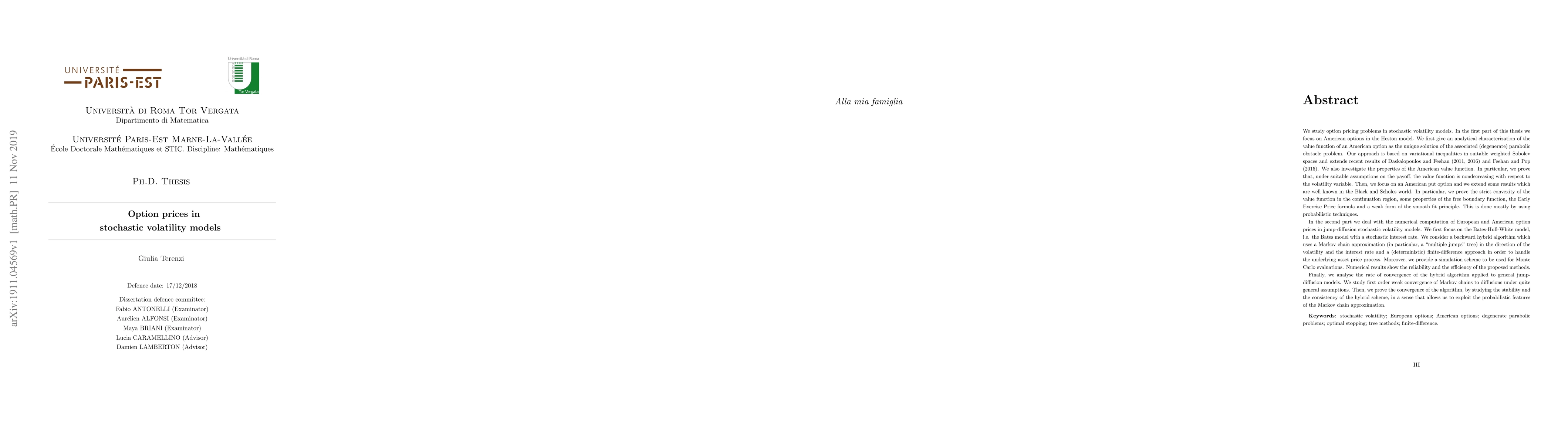 In the first part of this thesis, we focus on American options in the Heston model. We first give an analytical characterization of the value function of an American option as the unique solution of the associated (degenerate) parabolic obstacle problem. Our approach is based on variational inequalities in suitable weighted Sobolev spaces. We also investigate the properties of the American value function. We prove that, under suitable assumptions on the payoff, the value function is nondecreasing with respect to the volatility variable. Then, we focus on an American put option and we extend some results which are well known in the Black and Scholes world. In particular, we prove the strict convexity of the value function in the continuation region, some properties of the free boundary function, the Early Exercise Price formula and a weak form of the smooth fit principle. In the second part, we deal with the numerical computation of European and American option prices in jump-diffusion stochastic volatility models. We first focus on the Bates-Hull-White model. We consider a backward hybrid algorithm which uses a Markov chain approximation (a "multiple jumps" tree) in the direction of the volatility and the interest rate and a (deterministic) finite-difference approach in order to handle the underlying asset price process. We also provide a simulation scheme to be used for Monte Carlo evaluations. Numerical results show the reliability and efficiency of the methods. Finally, we analyse the rate of convergence of the hybrid algorithm applied to general jump-diffusion models. We study first-order weak convergence of Markov chains to diffusions under quite general assumptions. Then, we prove the convergence of the algorithm, by studying the stability and the consistency of the hybrid scheme, in a sense that allows us to exploit the probabilistic features of the Markov chain approximation.