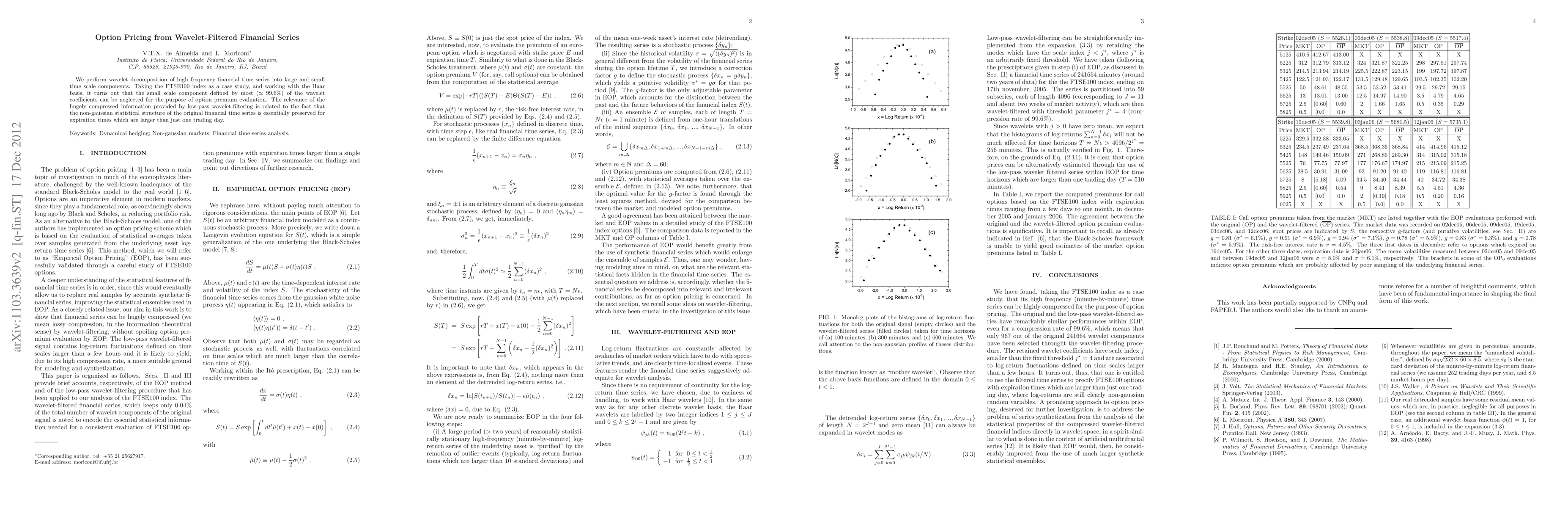 We perform wavelet decomposition of high frequency financial time series into large and small time scale components. Taking the FTSE100 index as a case study, and working with the Haar basis, it turns out that the small scale component defined by most ($\simeq$ 99.6%) of the wavelet coefficients can be neglected for the purpose of option premium evaluation. The relevance of the hugely compressed information provided by low-pass wavelet-filtering is related to the fact that the non-gaussian statistical structure of the original financial time series is essentially preserved for expiration times which are larger than just one trading day.