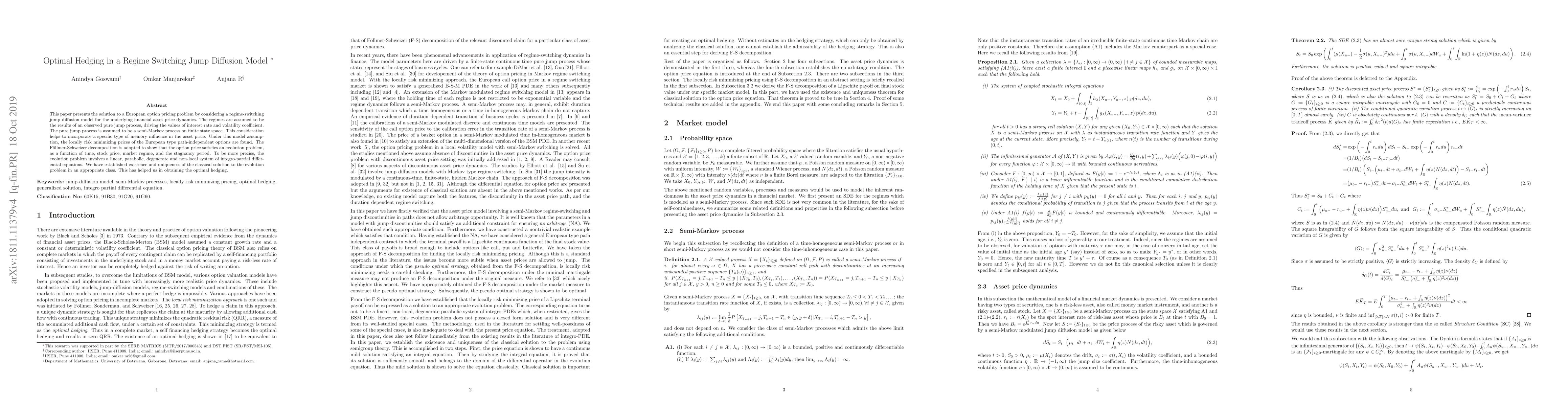 This paper presents the solution to a European option pricing problem by considering a regime-switching jump diffusion model of the underlying financial asset price dynamics. The regimes are assumed to be the results of an observed pure jump process, driving the values of interest rate and volatility coefficient. The pure jump process is assumed to be a semi-Markov process on finite state space. This consideration helps to incorporate a specific type of memory influence in the asset price. Under this model assumption, the locally risk minimizing price of the European type path-independent options is found. The F\"{o}llmer-Schweizer decomposition is adopted to show that the option price satisfies an evolution problem, as a function of time, stock price, market regime, and the stagnancy period. To be more precise, the evolution problem involves a linear, parabolic, degenerate and non-local system of integro-partial differential equations. We have established existence and uniqueness of classical solution to the evolution problem in an appropriate class.