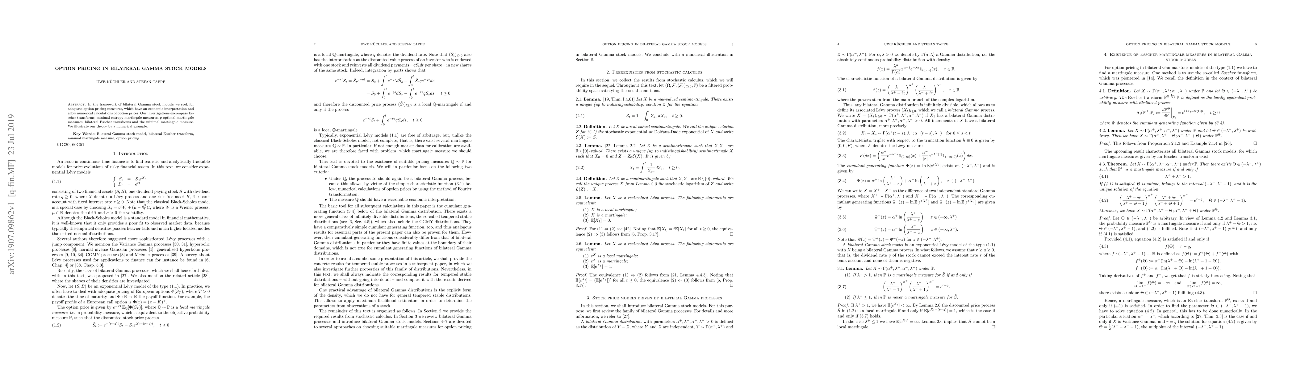 This paper explores option pricing in bilateral Gamma stock models, investigating various transforms and measures including Esscher transforms, minimal entropy martingale measures, and $p$-optimal martingale measures to derive economically interpretable and numerically calculable option prices, supported by a numerical example.