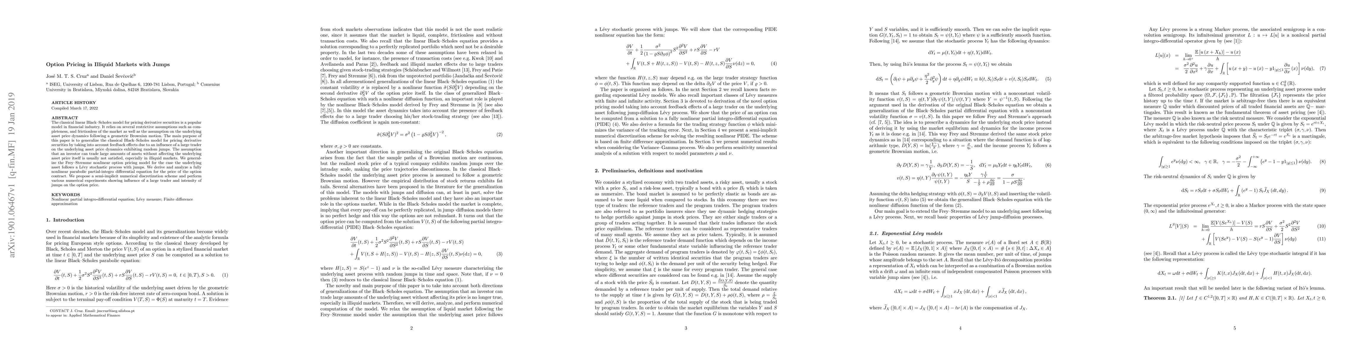 This paper generalizes the Black-Scholes model to price options in illiquid markets with jumps, addressing the impact of large traders on asset price dynamics. It proposes a semi-implicit numerical scheme to solve the derived nonlinear partial-integro differential equation and demonstrates the effects of trader influence and jump intensity on option pricing.