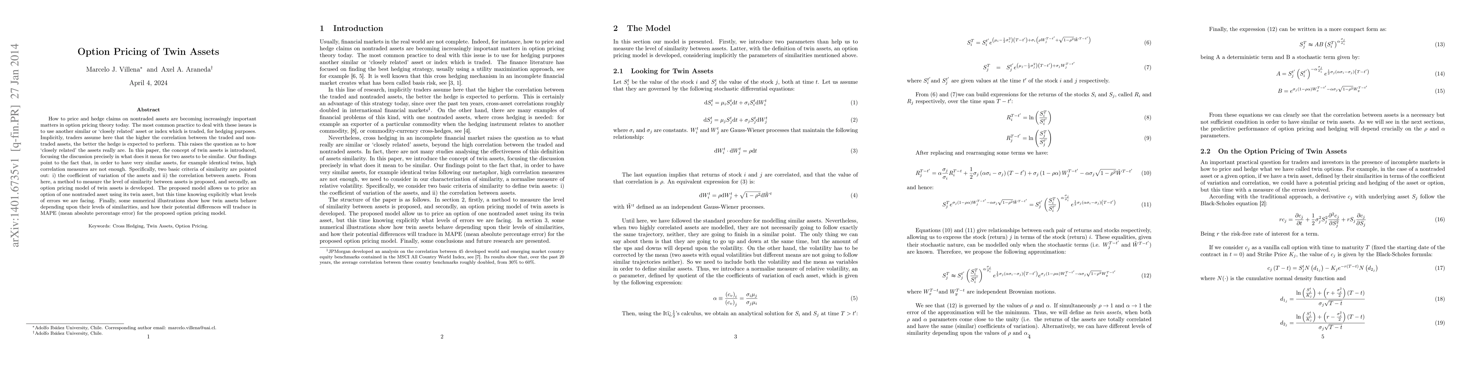 How to price and hedge claims on nontraded assets are becoming increasingly important matters in option pricing theory today. The most common practice to deal with these issues is to use another similar or "closely related" asset or index which is traded, for hedging purposes. Implicitly, traders assume here that the higher the correlation between the traded and nontraded assets, the better the hedge is expected to perform. This raises the question as to how \textquoteleft{}closely related\textquoteright{} the assets really are. In this paper, the concept of twin assets is introduced, focusing the discussion precisely in what does it mean for two assets to be similar. Our findings point to the fact that, in order to have very similar assets, for example identical twins, high correlation measures are not enough. Specifically, two basic criteria of similarity are pointed out: i) the coefficient of variation of the assets and ii) the correlation between assets. From here, a method to measure the level of similarity between assets is proposed, and secondly, an option pricing model of twin assets is developed. The proposed model allows us to price an option of one nontraded asset using its twin asset, but this time knowing explicitly what levels of errors we are facing. Finally, some numerical illustrations show how twin assets behave depending upon their levels of similarities, and how their potential differences will traduce in MAPE (mean absolute percentage error) for the proposed option pricing model.