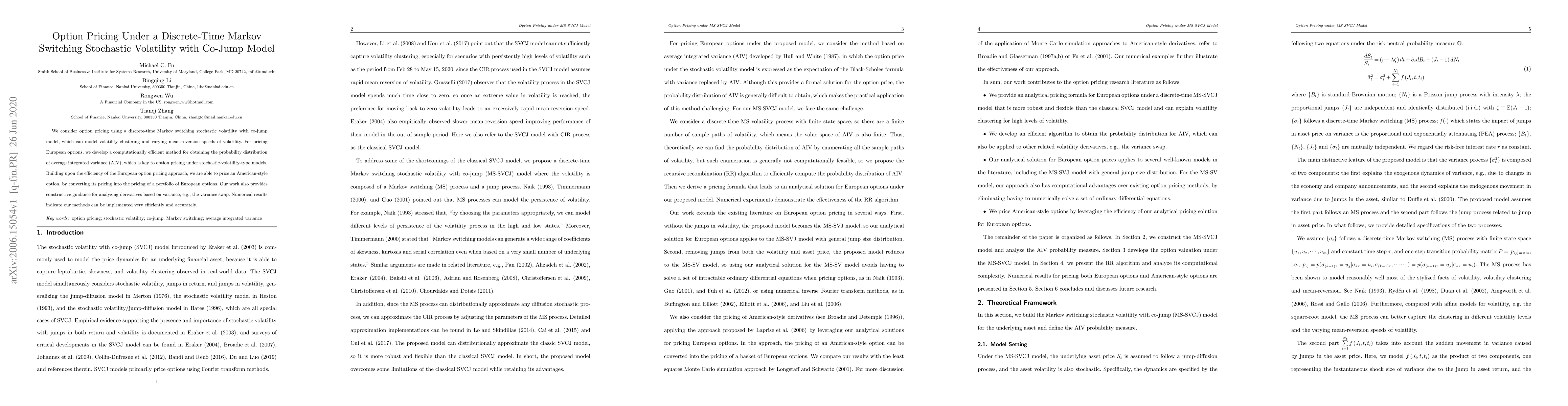 This paper develops a discrete-time Markov switching stochastic volatility model with co-jumps for option pricing, efficiently obtaining the probability distribution of average integrated variance (AIV). It extends the method to price American-style options by converting them into portfolios of European options, and provides accurate numerical results.