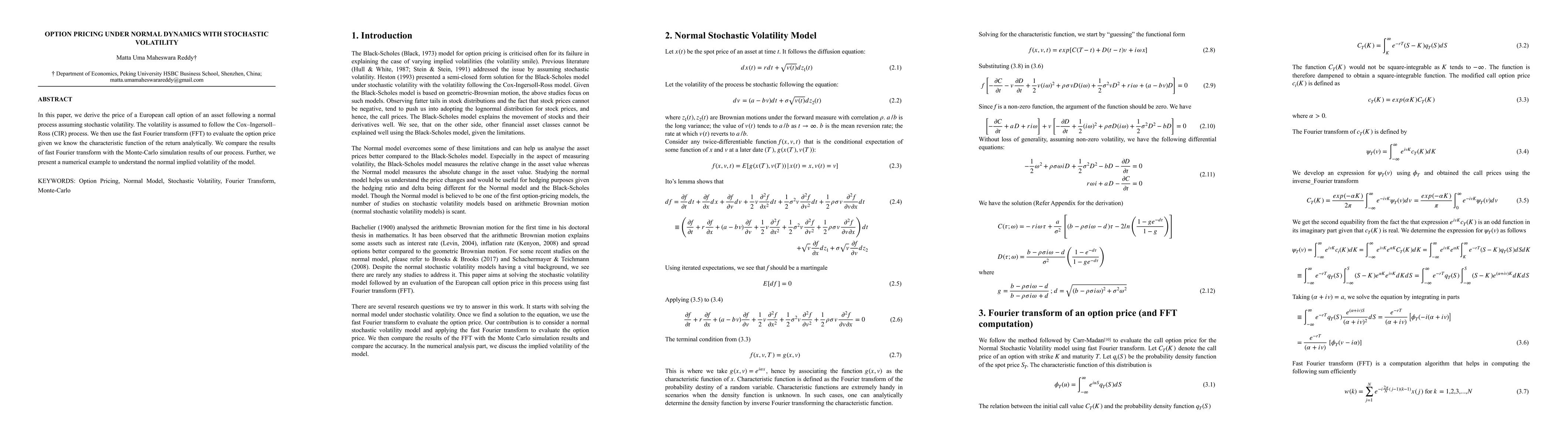 This paper derives the price of a European call option under normal dynamics with stochastic volatility modeled by a Cox Ingersoll Ross (CIR) process, employing the fast Fourier transform (FFT) for evaluation. The FFT results are compared to Monte Carlo simulations, and a numerical example is presented to illustrate the normal implied volatility.
