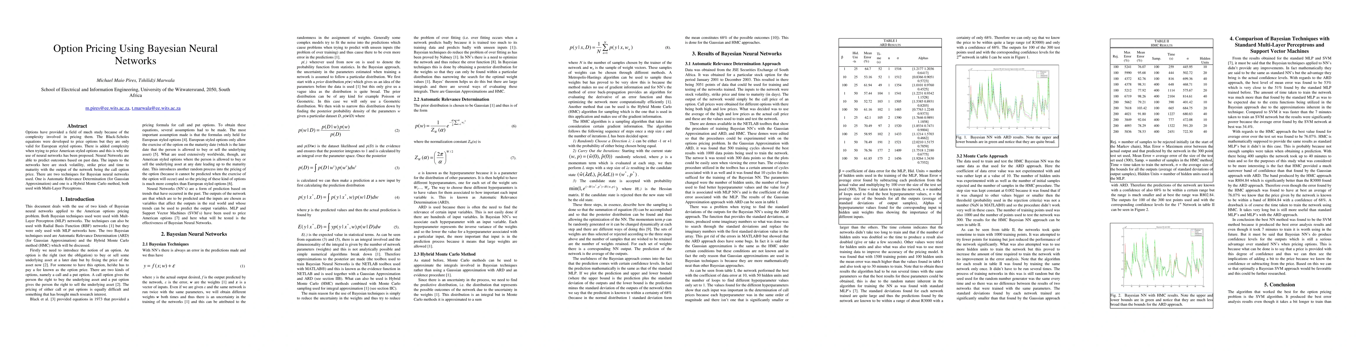 This paper explores the use of Bayesian neural networks for option pricing, specifically focusing on American styled options. It employs two Bayesian techniques—Automatic Relevance Determination and Hybrid Monte Carlo methods—with Multi-Layer Perceptrons to predict call option prices based on inputs like stock volatility, strike price, and time to maturity.