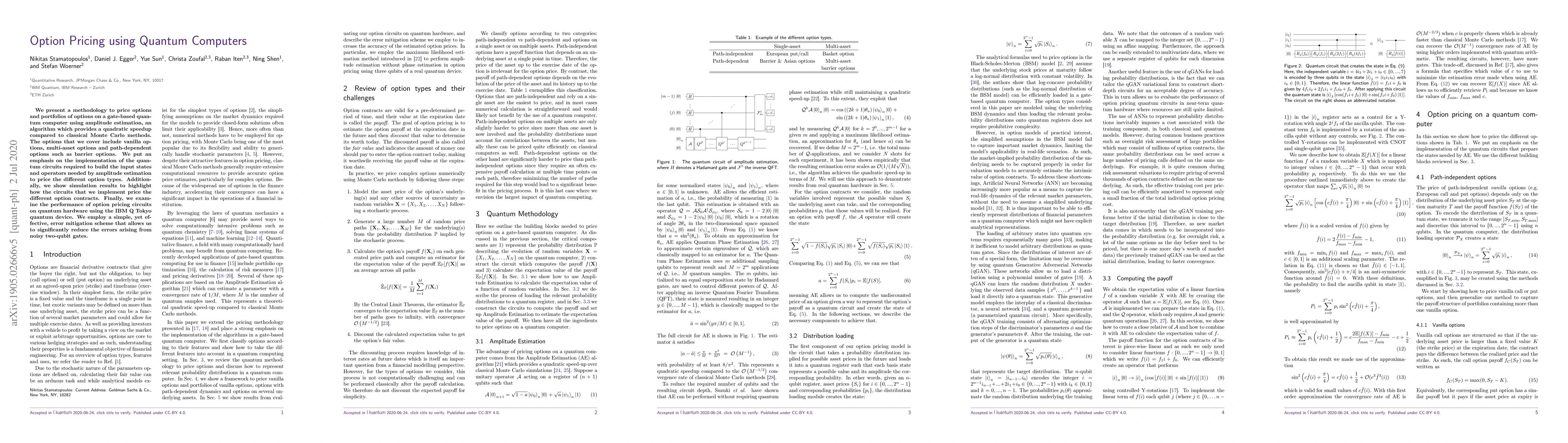This paper proposes a quantum computing approach for pricing various options using amplitude estimation, achieving a quadratic speedup over classical methods. It details the quantum circuits for different option types and demonstrates their performance on IBM Q Tokyo hardware, employing error mitigation to handle noisy gates.