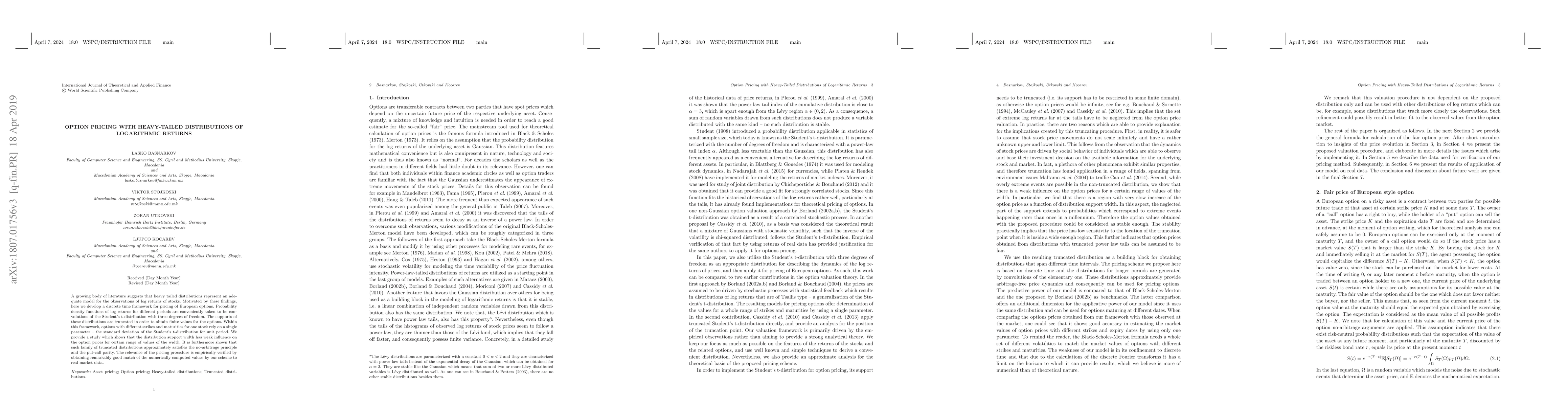 This paper develops a pricing framework for European options using heavy-tailed distributions, specifically truncated Student's t-distributions, to model stock returns. The model shows good empirical fit to real market data and satisfies no-arbitrage principles and put-call parity.
