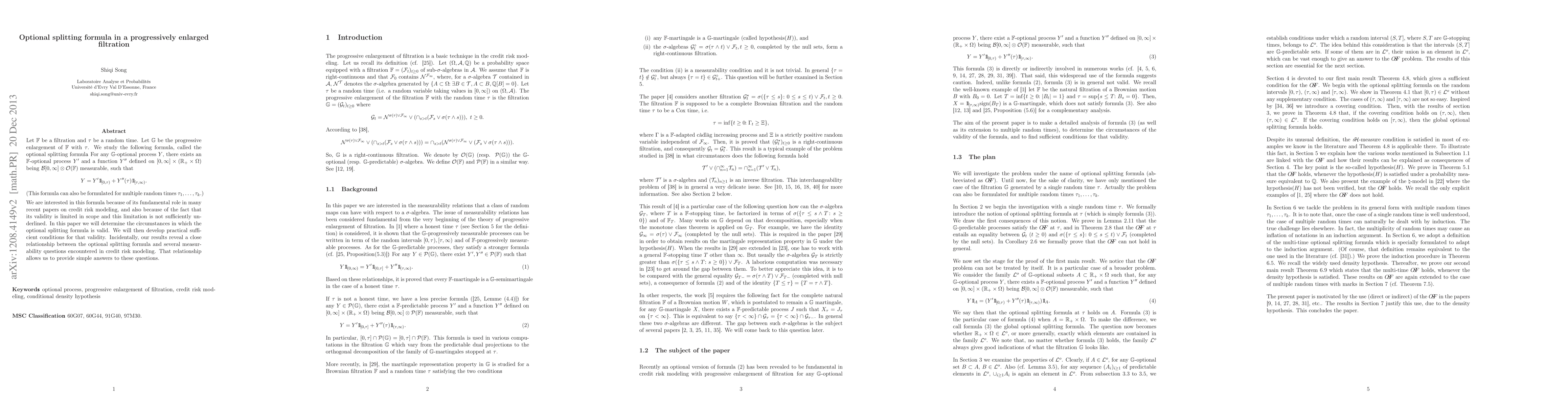 Let $\mathbb{F}$ be a filtration and $\tau$ be a random time. Let $\mathbb{G}$ be the progressive enlargement of $\mathbb{F}$ with $\tau$. We study the validity of the following formula, called optional splitting formula : For any $\mathbb{G}$-optional process $Y$, there exist a $\mathbb{F}$-optional process $Y'$ and a function $Y"$ defined on $[0,\infty]\times(\mathbb{R}_+\times\Omega)$ being $\mathcal{B}[0,\infty]\otimes\mathcal{O}(\mathbb{F})$ measurable, such that $$ Y=Y'\ind_{[0,\tau)}+Y"(\tau)\ind_{[\tau,\infty)} $$ We are interested in this formula, because it has been taken for granted in number of recent works in credit risk modeling, whilst such a formula can not be true in general. Sufficient conditions will be given for the validity of the above formula as well as of its extension in the case of multiple random times.