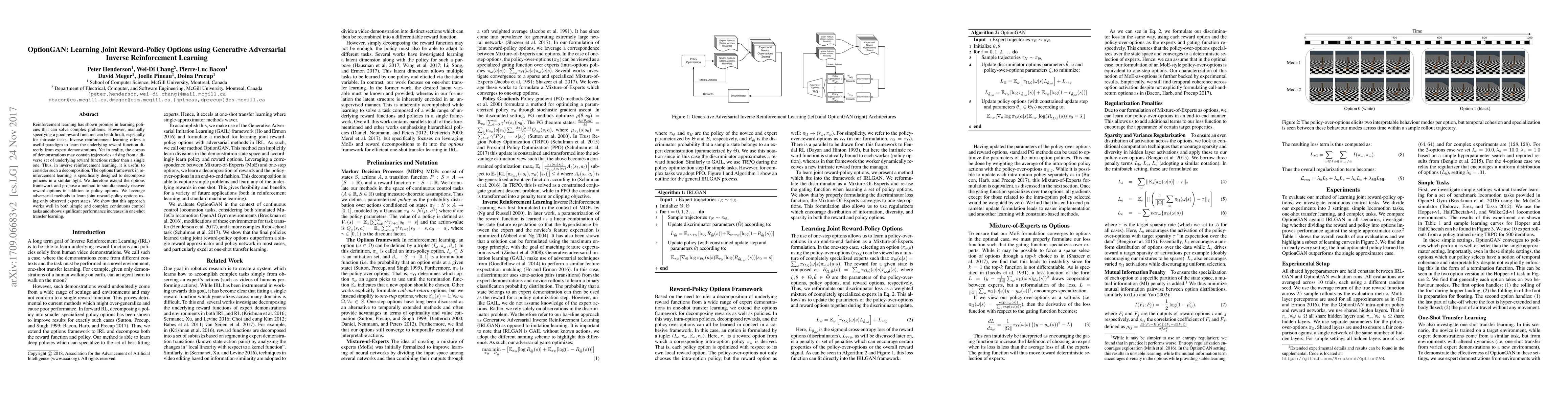 OptionGAN proposes a method to learn joint reward-policy options using Generative Adversarial Inverse Reinforcement Learning, enabling the decomposition of diverse reward functions from expert demonstrations. This approach demonstrates significant performance improvements in both simple and complex continuous control tasks, particularly in one-shot transfer learning.