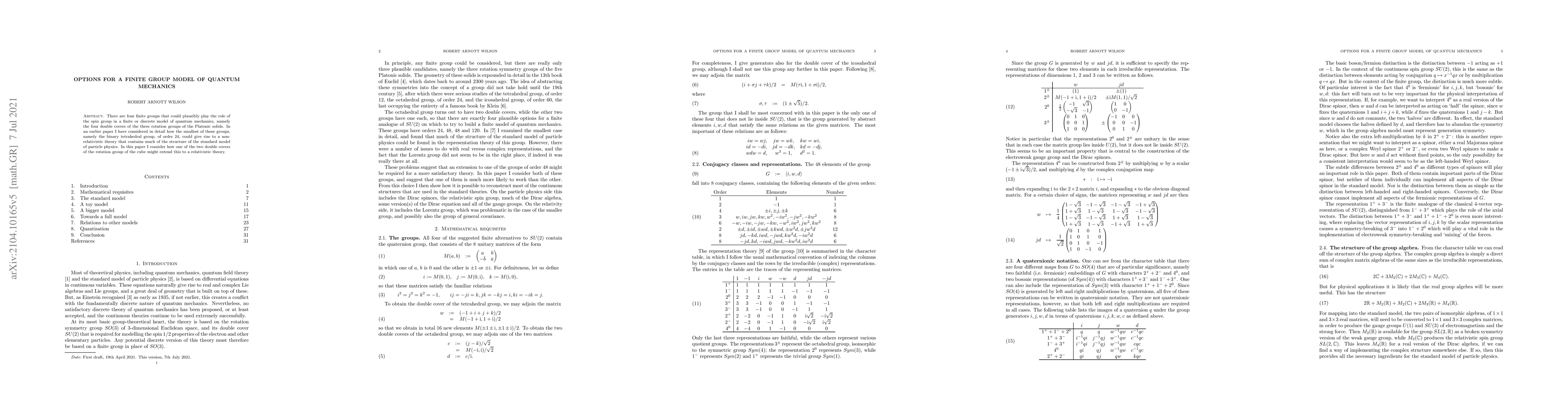 There are four finite groups that could plausibly play the role of the spin group in a finite or discrete model of quantum mechanics, namely the four double covers of the three rotation groups of the Platonic solids. In an earlier paper I have considered in detail how the smallest of these groups, namely the binary tetrahedral group, of order 24, could give rise to a non-relativistic theory that contains much of the structure of the standard model of particle physics. In this paper I consider how one of the two double covers of the rotation group of the cube might extend this to a relativistic theory.