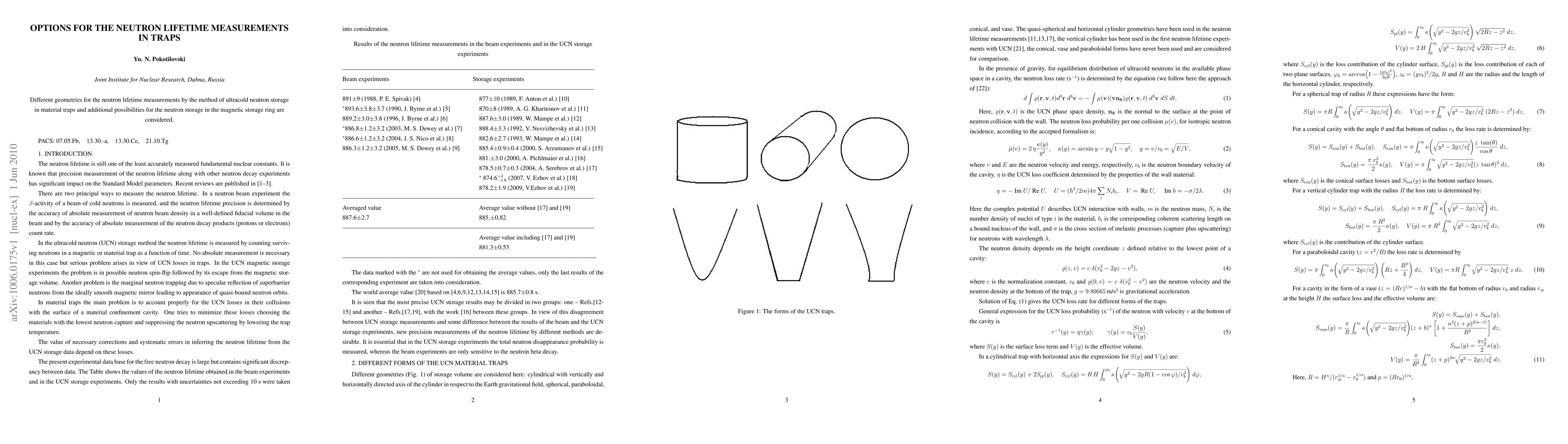 Different geometries for the neutron lifetime measurements by the method of ultracold neutron storage in material traps and additional possibilities for the neutron storage in the magnetic storage ring are considered.