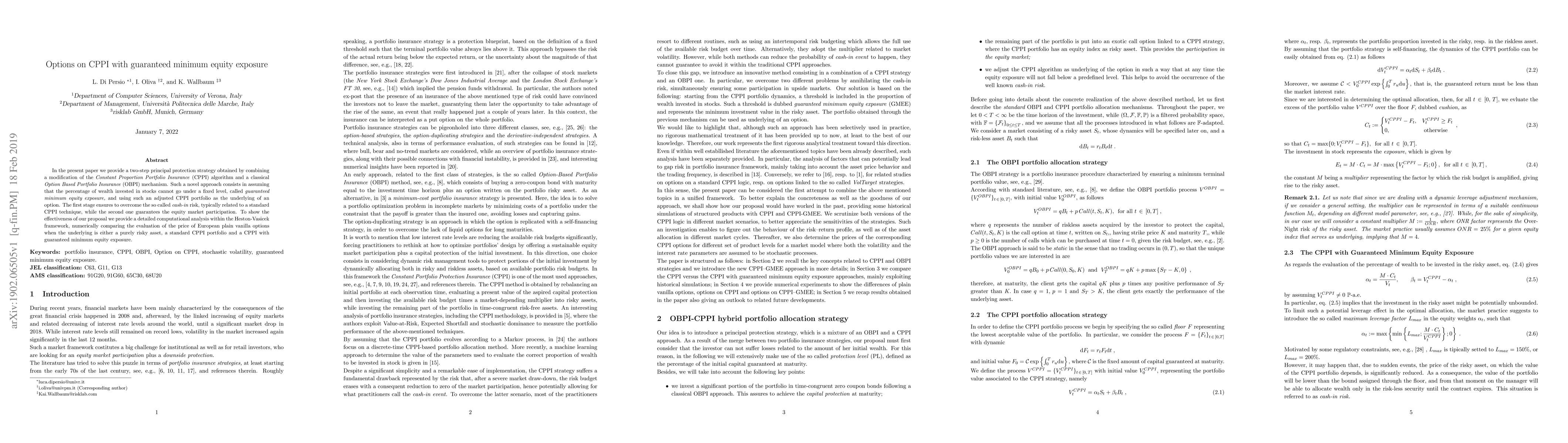 In the present paper we provide a two-step principal protection strategy obtained by combining a modification of the Constant Proportion Portfolio Insurance (CPPI) algorithm and a classical Option Based Portfolio Insurance (OBPI) mechanism. Such a novel approach consists in assuming that the percentage of wealth invested in stocks cannot go under a fixed level, called guaranteed minimum equity exposure, and using such an adjusted CPPI portfolio as the underlying of an option. The first stage ensures to overcome the so called cash-in risk, typically related to a standard CPPI technique, while the second one guarantees the equity market participation. To show the effectiveness of our proposal we provide a detailed computational analysis within the Heston-Vasicek framework, numerically comparing the evaluation of the price of European plain vanilla options when the underlying is either a purely risky asset, a standard CPPI portfolio and a CPPI with guaranteed minimum equity exposure.