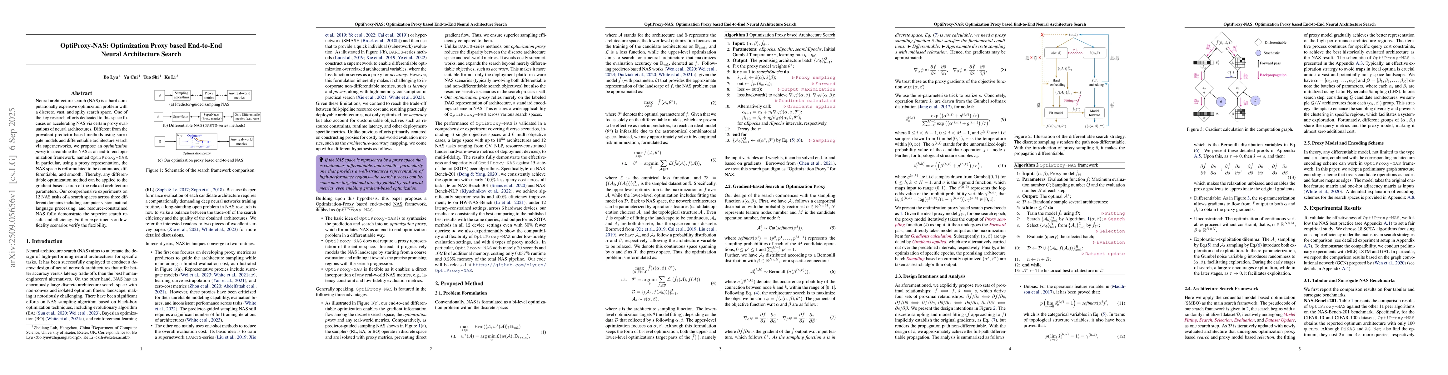 Neural architecture search (NAS) is a hard computationally expensive optimization problem with a discrete, vast, and spiky search space. One of the key research efforts dedicated to this space focuses on accelerating NAS via certain proxy evaluations of neural architectures. Different from the prevalent predictor-based methods using surrogate models and differentiable architecture search via supernetworks, we propose an optimization proxy to streamline the NAS as an end-to-end optimization framework, named OptiProxy-NAS. In particular, using a proxy representation, the NAS space is reformulated to be continuous, differentiable, and smooth. Thereby, any differentiable optimization method can be applied to the gradient-based search of the relaxed architecture parameters. Our comprehensive experiments on $12$ NAS tasks of $4$ search spaces across three different domains including computer vision, natural language processing, and resource-constrained NAS fully demonstrate the superior search results and efficiency. Further experiments on low-fidelity scenarios verify the flexibility.
